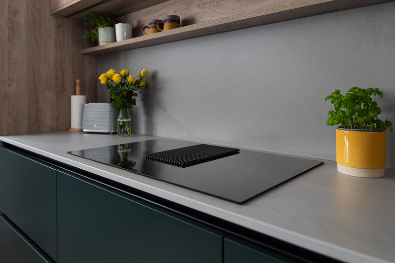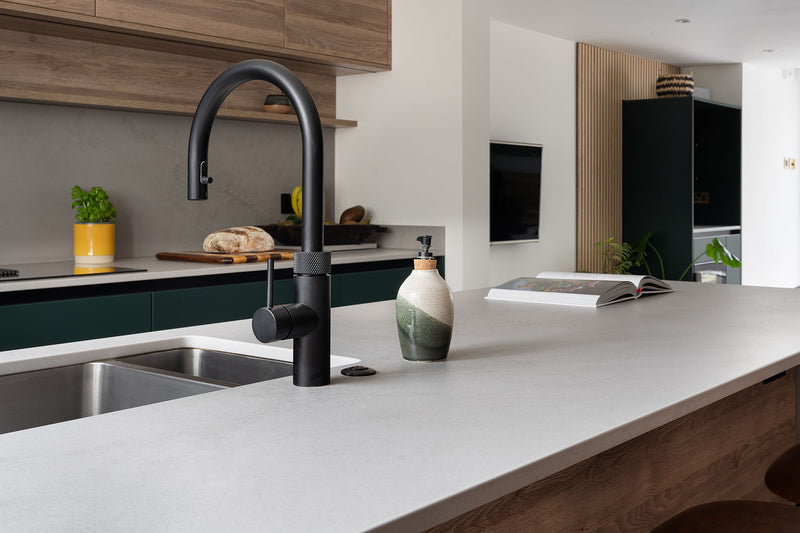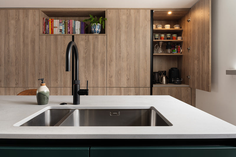 The appliance suite from Miele, Bosch, and other top brands ensures efficiency and quality. Notable additions like the Elica vented hob, Caple wine cooler, and Quooker boiling water tap provide essential functionality, maintaining the kitchen's modern and eco-friendly ethos.