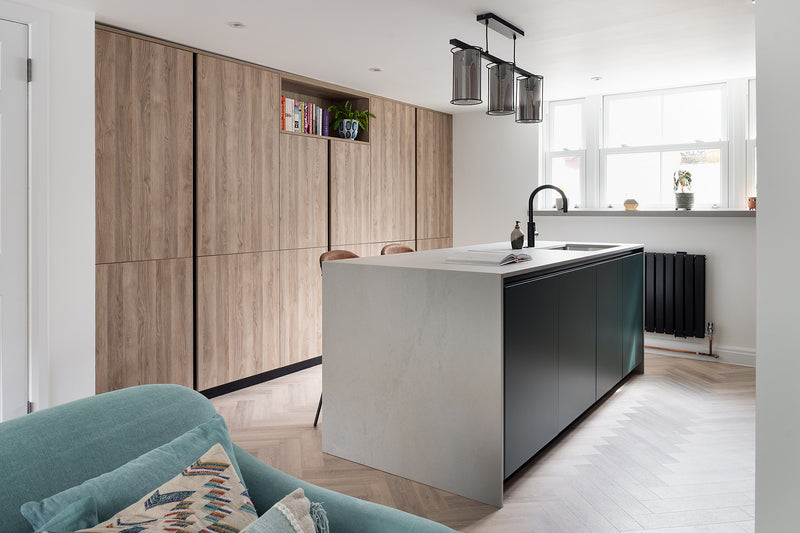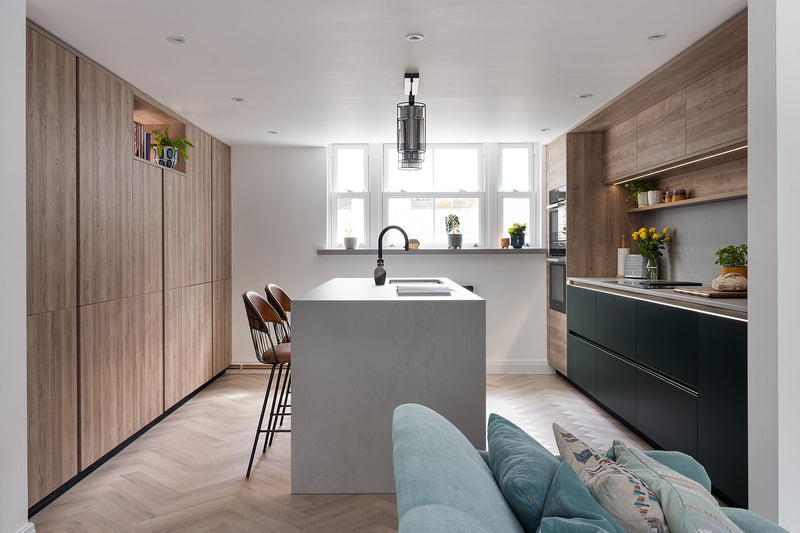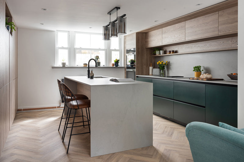 This kitchen redesign features Beckermann cabinetry in Colorado Jungle Green and Tessina Oak Greige laminate, transforming a dual-purpose space into a unified living and entertaining area. The cabinetry choice highlights our commitment to sustainability, aligning with our carbon-neutral goals.