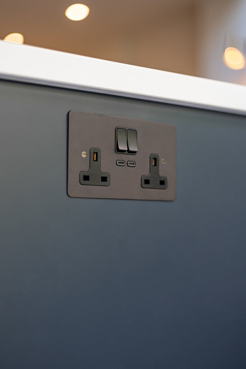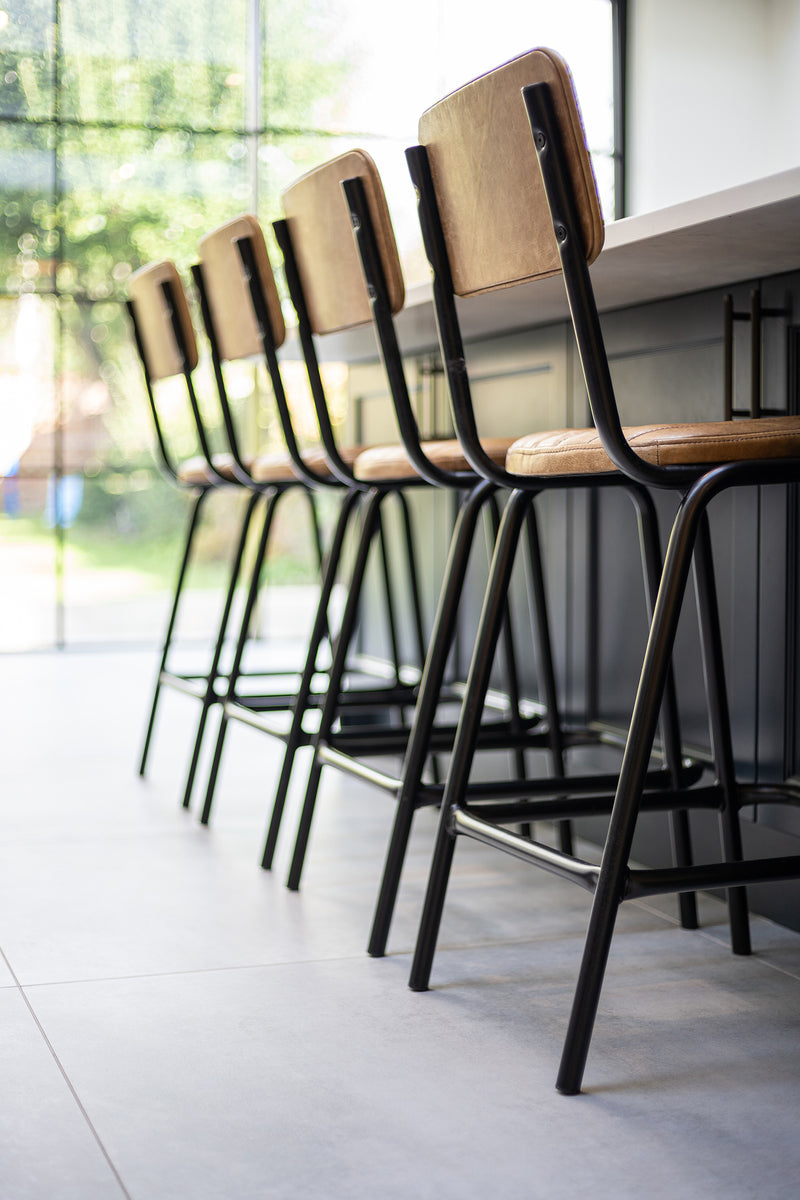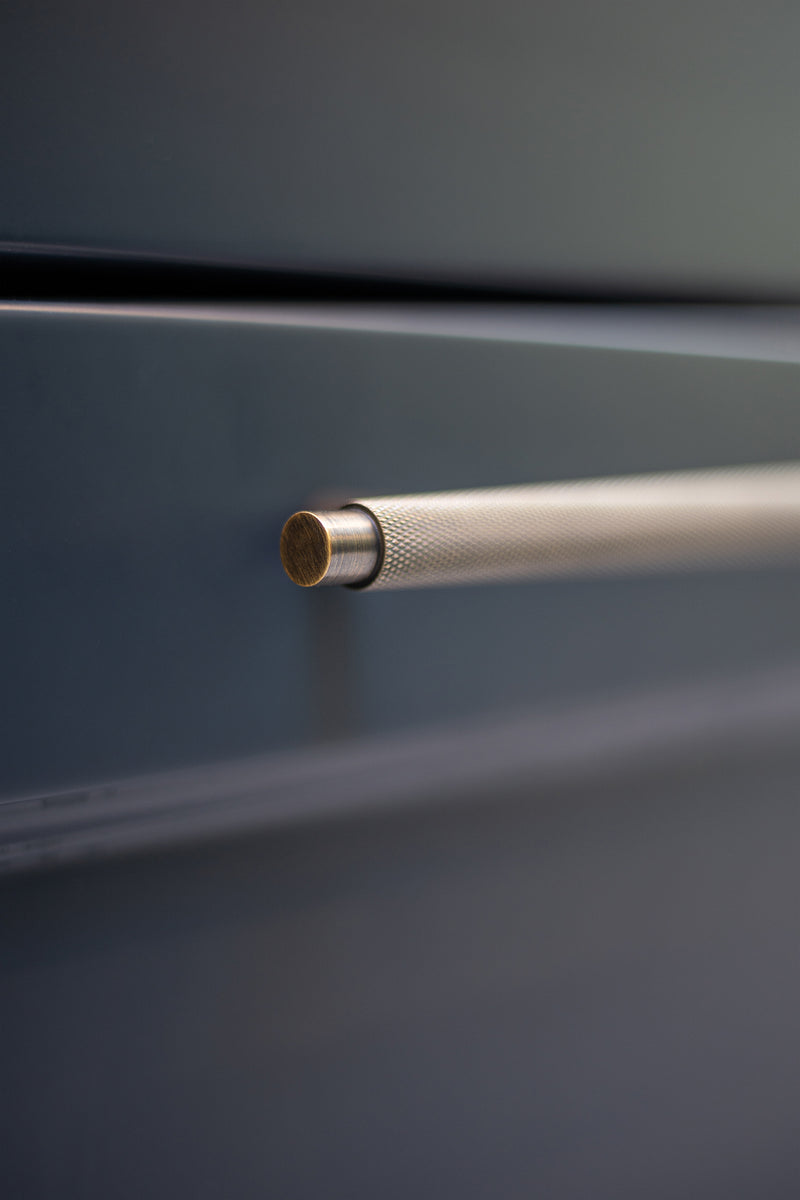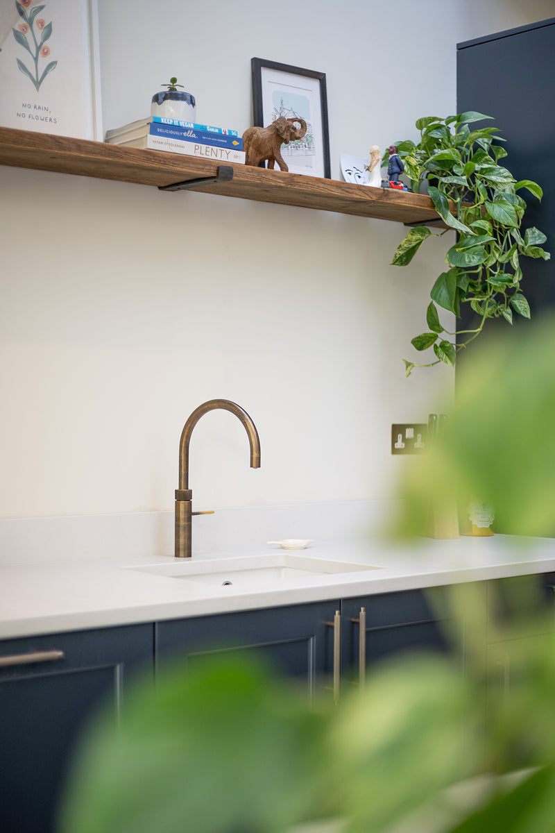 We contrasted the worktops by choosing railings for our cabinetry – a soft black with deep blue undertones. And to tie everything together, we opted for a patinated brass Quooker tap, patinated brass handles and four bar stools of a similar shade.