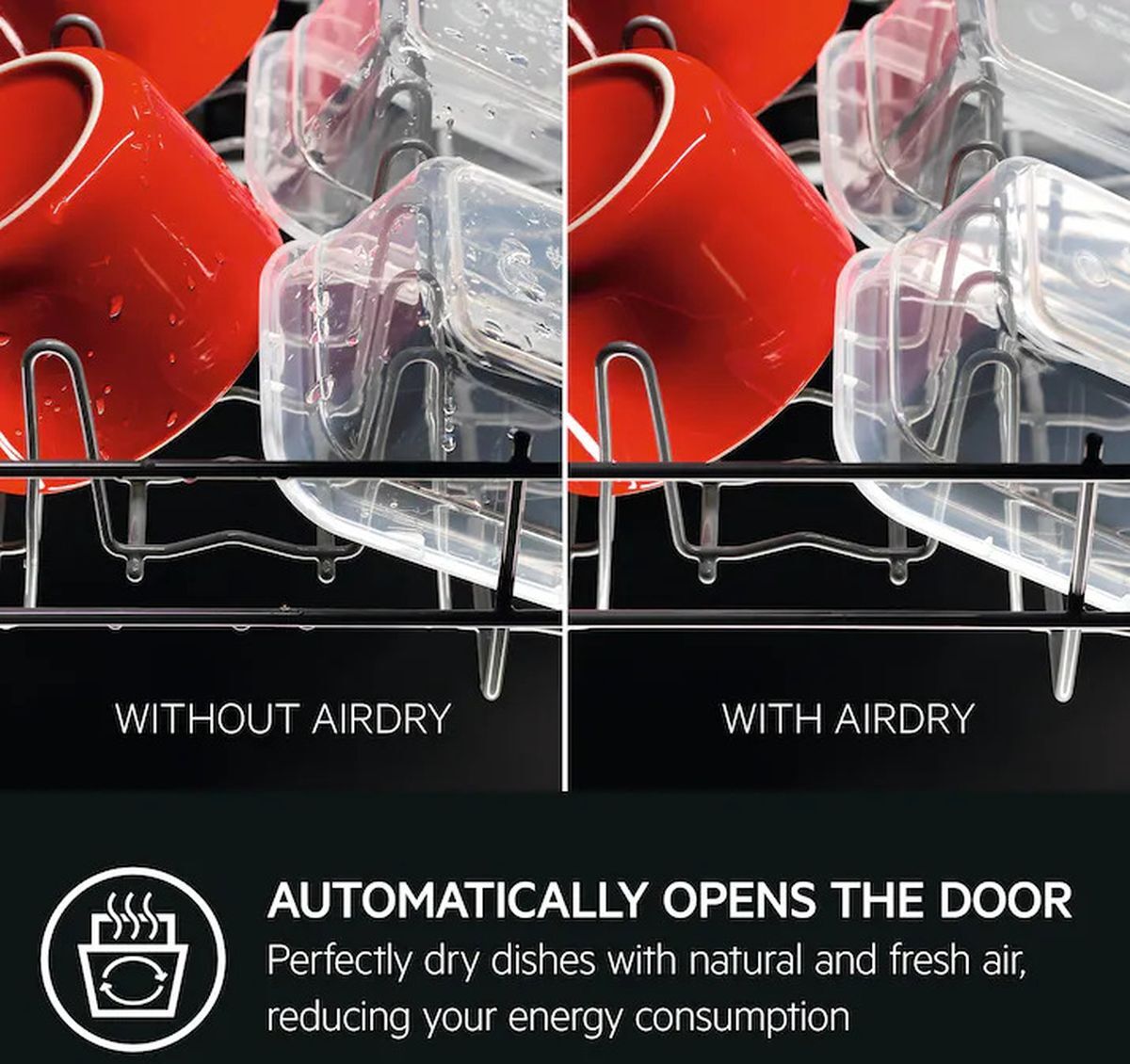 Further enhancing its practicality, the dishwasher comes with AirDry Technology, which automatically opens the door at the end of the cycle to allow natural air drying. This helps to improve drying performance while reducing energy consumption. The Aqua Control feature and the floating switch anti-flood device offer additional safety, preventing any potential water damage to your kitchen.
