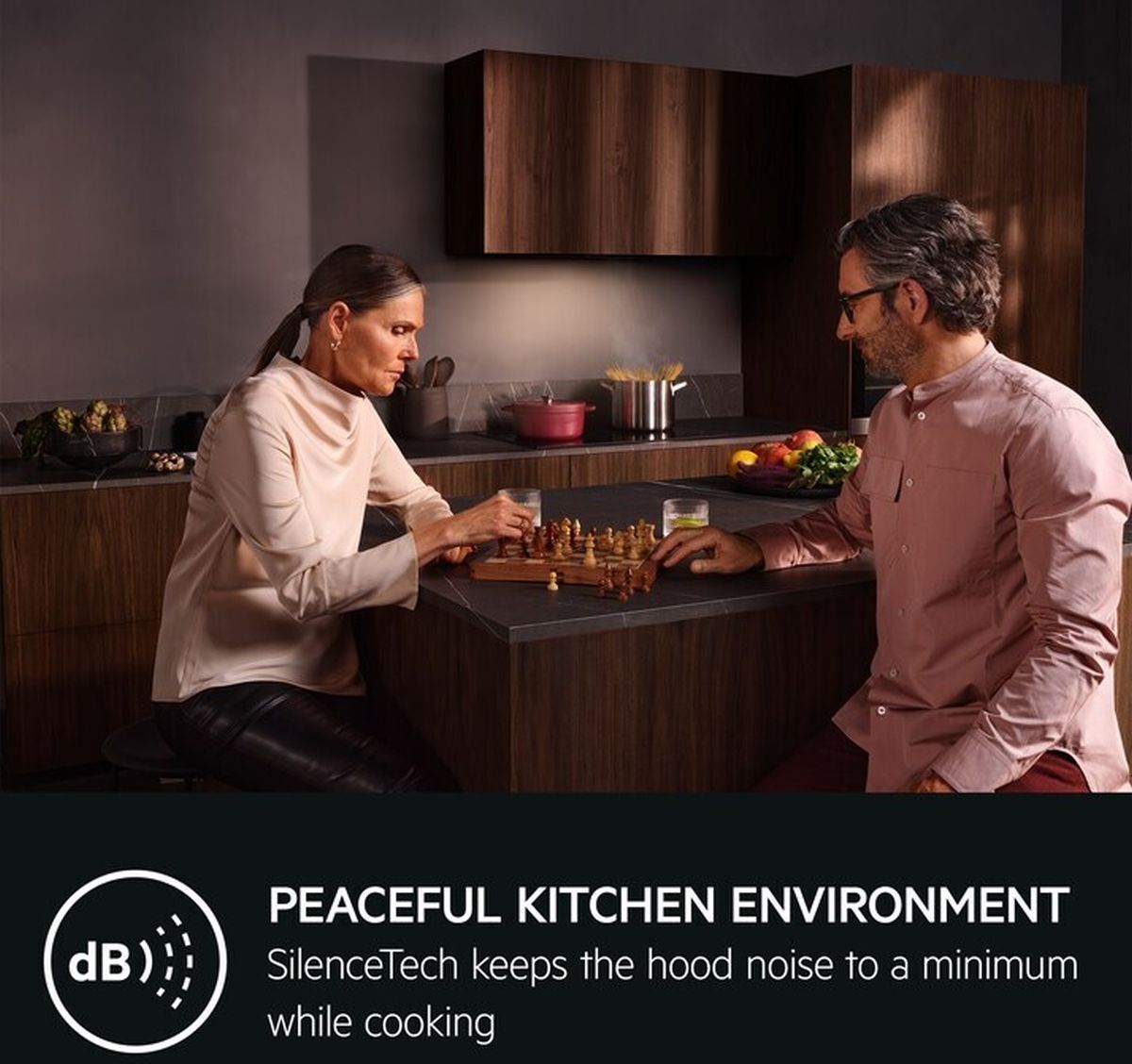 Despite its powerful extraction capabilities, the AEG GDG961AB is designed with noise control in mind. In normal use, the maximum noise level reaches just 54 dB, ensuring that it won’t disrupt the ambiance of your kitchen. Even when using the booster function, which ramps up the extraction rate, the noise level only increases to a moderate 67 dB. This makes it ideal for open-plan living spaces where you don’t want the noise from your appliances to dominate the environment.
