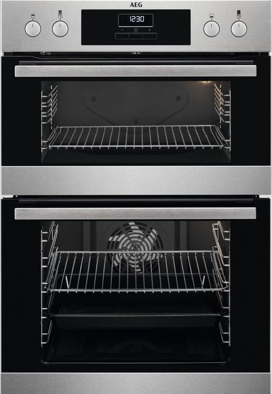 The AEG 6000 Series Multifunction Built-In Double Oven, DCB331010M, is a versatile and stylish addition to any modern kitchen. This appliance, finished in anti-fingerprint stainless steel, not only looks elegant but is also highly efficient, boasting an 'A/A' energy rating. It features a main oven with conventional heat, a variable grill, fan-controlled defrosting, and a self-cleaning function. The top oven offers additional cooking functions and a fully programmable timer. Both ovens have Isofront double glazed doors for better heat retention. The LED display and retractable controls enhance user convenience, making the DCB331010M an exemplary choice for culinary enthusiasts.