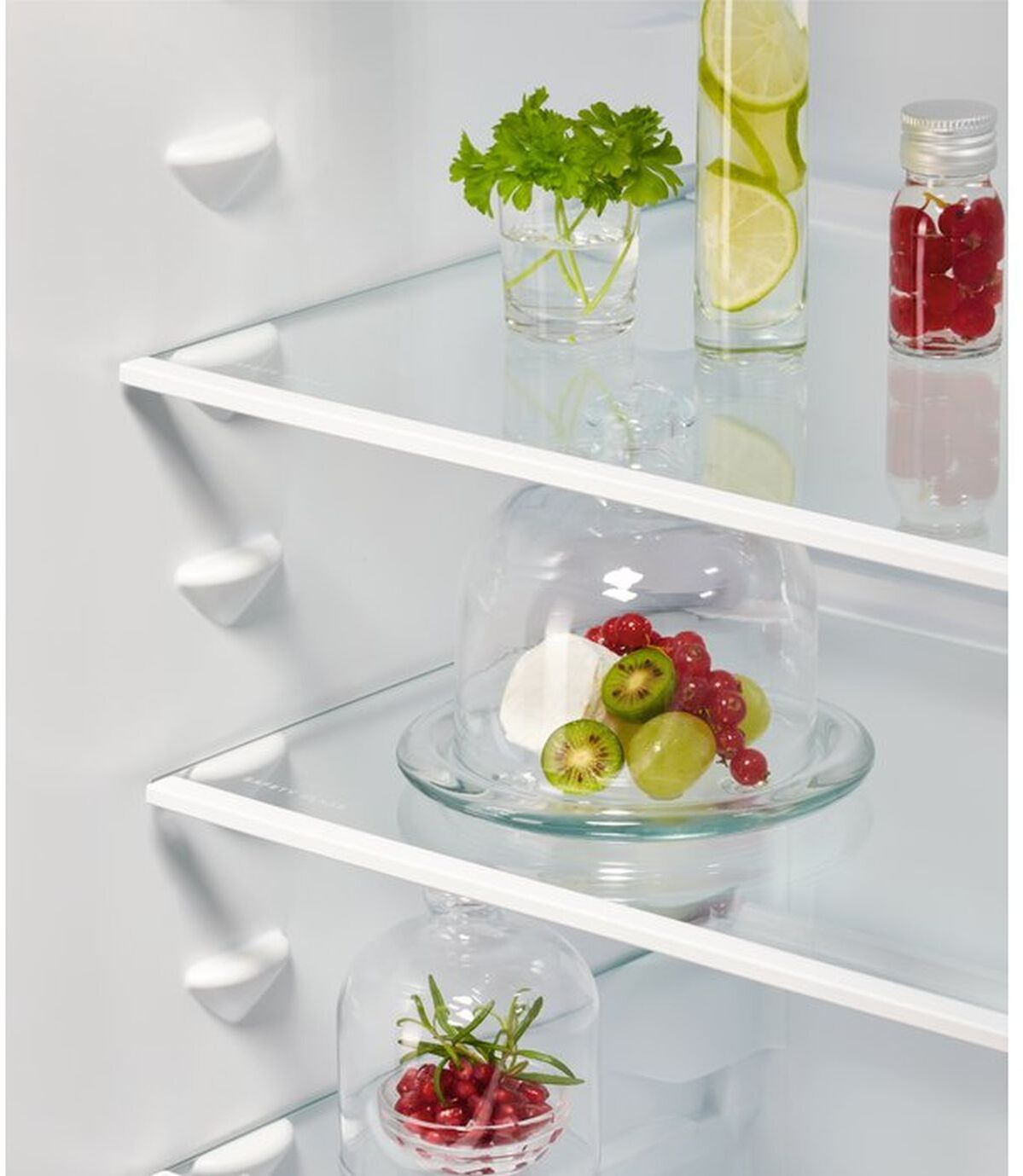 The fridge section features four adjustable glass shelves, two drawers, and three door bins, providing flexible storage options. The height-adjustable shelves allow for customisation to fit larger items, while humidity control ensures optimal conditions for fruits and vegetables. An LED interior light offers clear visibility, making it easy to organise and access food. The fridge also includes a bottle storage compartment in the door, allowing for convenient beverage storage.