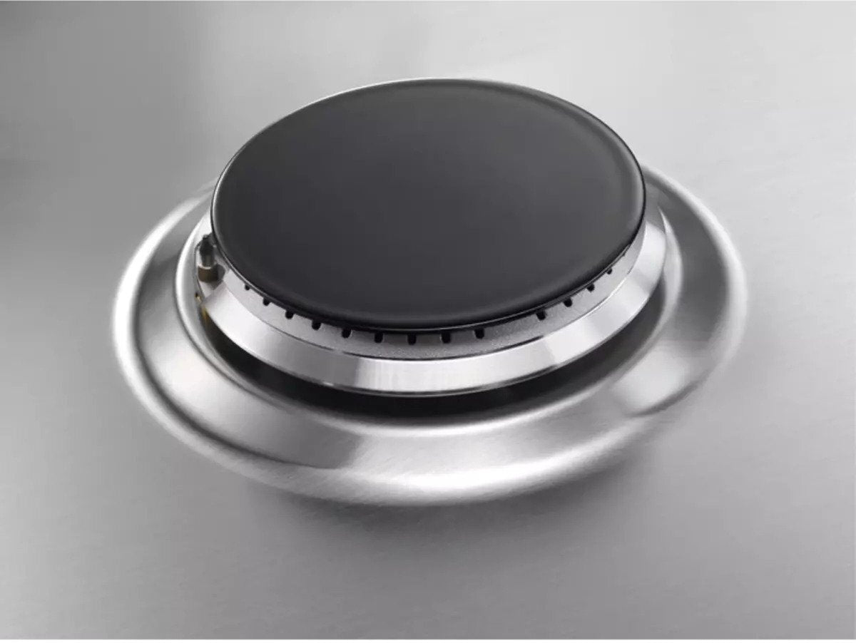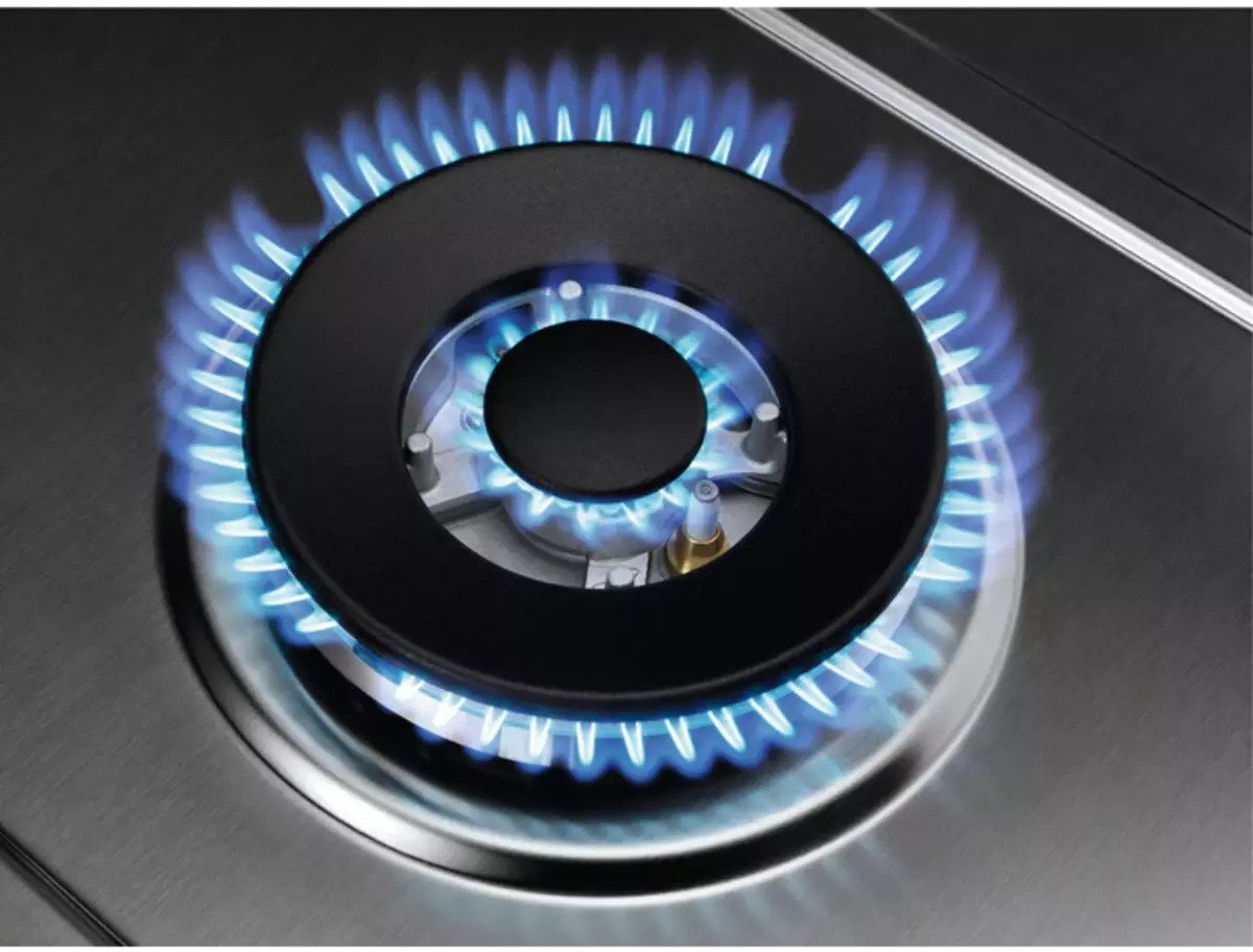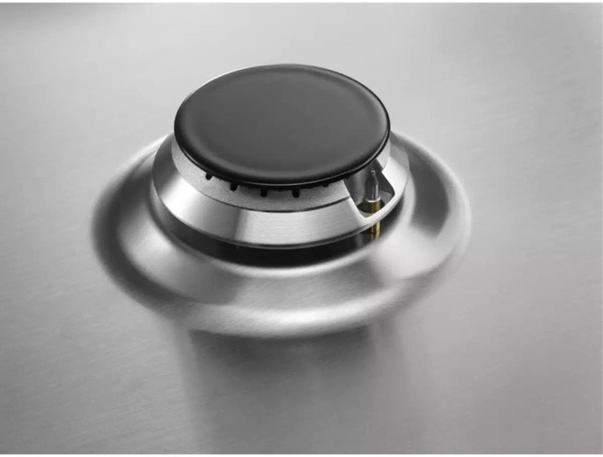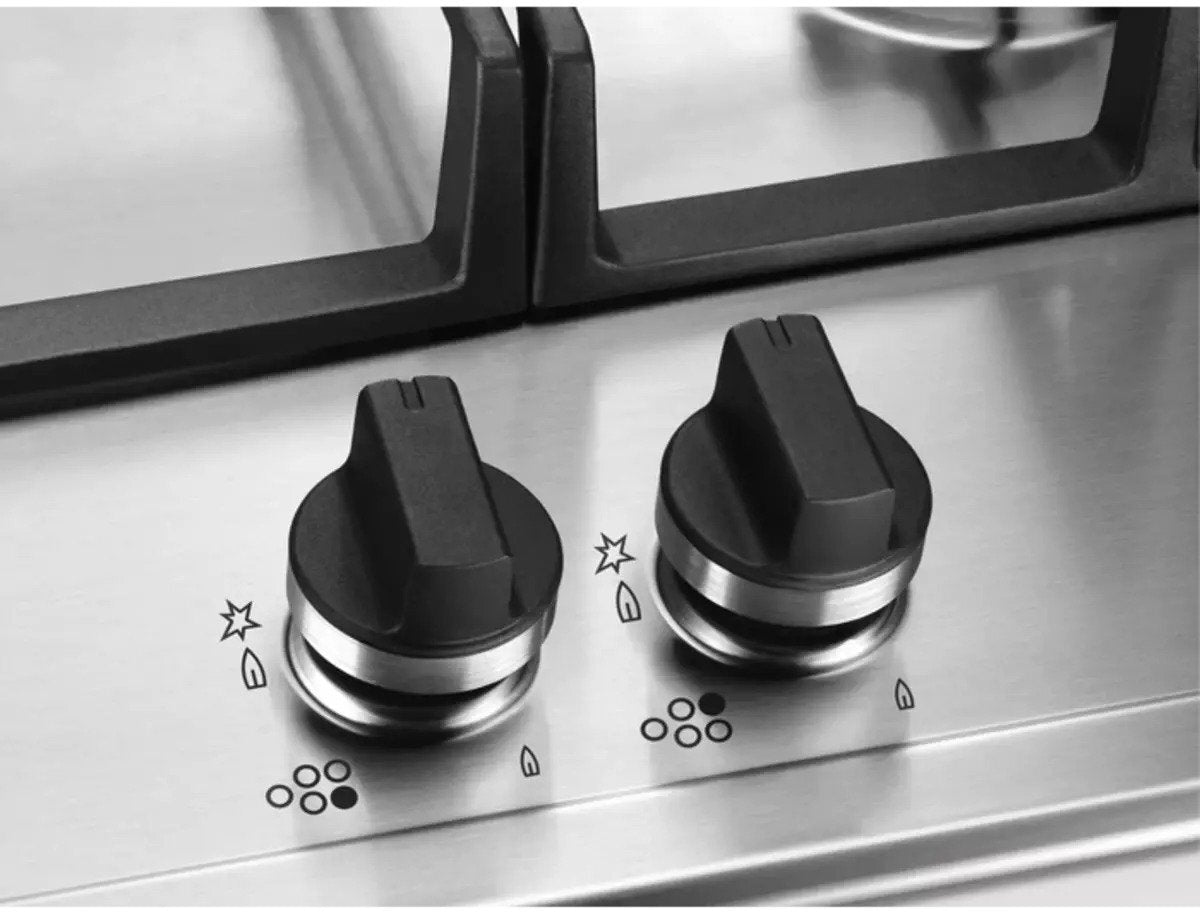 Crafted with a sophisticated stainless steel finish, the hob boasts a gas-on-glass control panel, combining the sleek aesthetic of ceramic glass with the practical benefits of gas cooking. This design not only enhances the appearance of your kitchen but also makes cleaning effortless. The steel-capped control knobs, positioned for easy access, further complement the hob’s contemporary look.