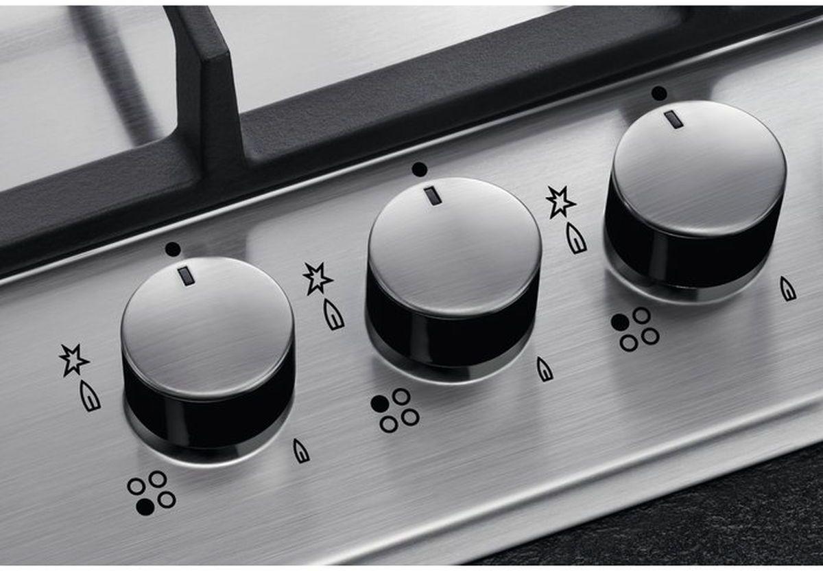 One of the standout features of the AEG HGX75400SM is its rotary control dials, positioned at the front for easy access and precise control. These controls are not only user-friendly but also enhance the overall aesthetic of the hob. The hob is equipped with automatic ignition, simplifying the cooking process by allowing users to ignite the burners with ease. This feature, combined with integrated ignition, ensures that the hob is always ready for use without the need for matches or lighters.