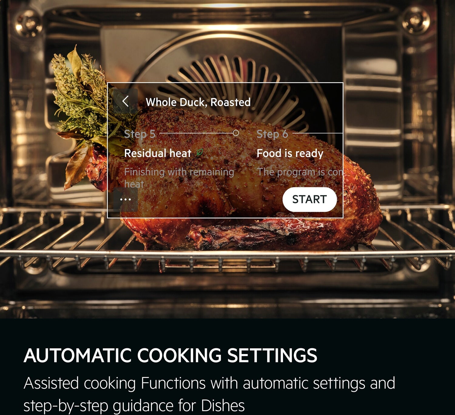 The oven is packed with 26 automatic programmes, including defrosting, plate warming, dough proving, and dehydrating, as well as conventional functions such as grill, fan cooking, top and bottom heat, and slow cooking. These programmes make it easy to prepare a wide variety of dishes with professional precision. The fan-assisted cooking function ensures even heat distribution for consistent baking and roasting, while the hot air setting reduces the need for preheating and lowers cooking temperatures, saving time and energy.