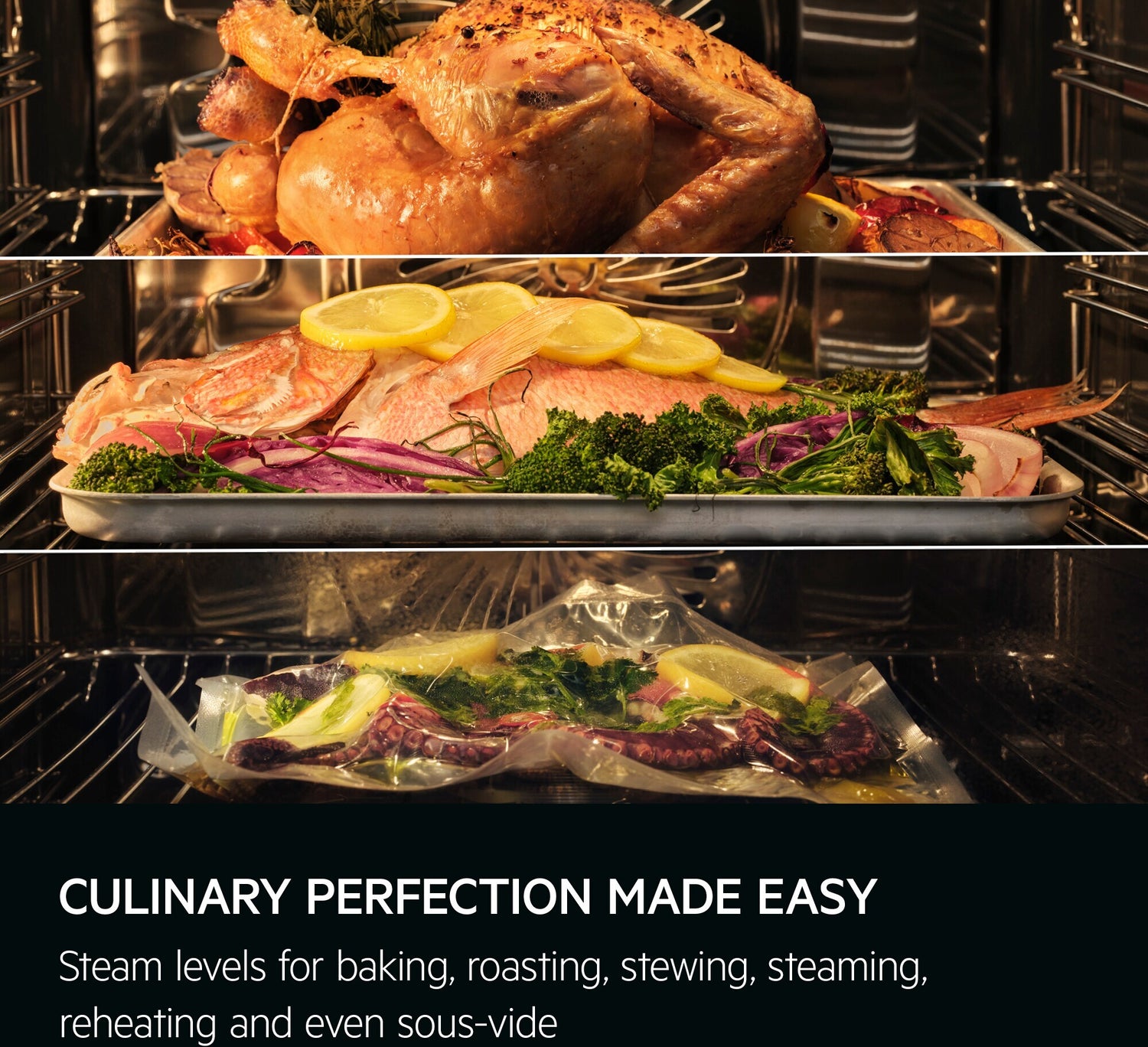 One of the standout features of the TP8SB731AB is its advanced steam-assisted cooking capability. Equipped with AEG’s SteamPro technology, it offers a range of steam levels—from full steam to low steam—allowing for precise moisture control to retain flavour, texture, and nutrients. This oven also includes the Steamify function, which automatically adjusts steam levels based on the cooking temperature selected, simplifying the process for those new to steam cooking. Additionally, the oven supports sous vide cooking, ideal for achieving consistent and tender results, and includes a food probe to ensure perfectly cooked meat and fish every time.