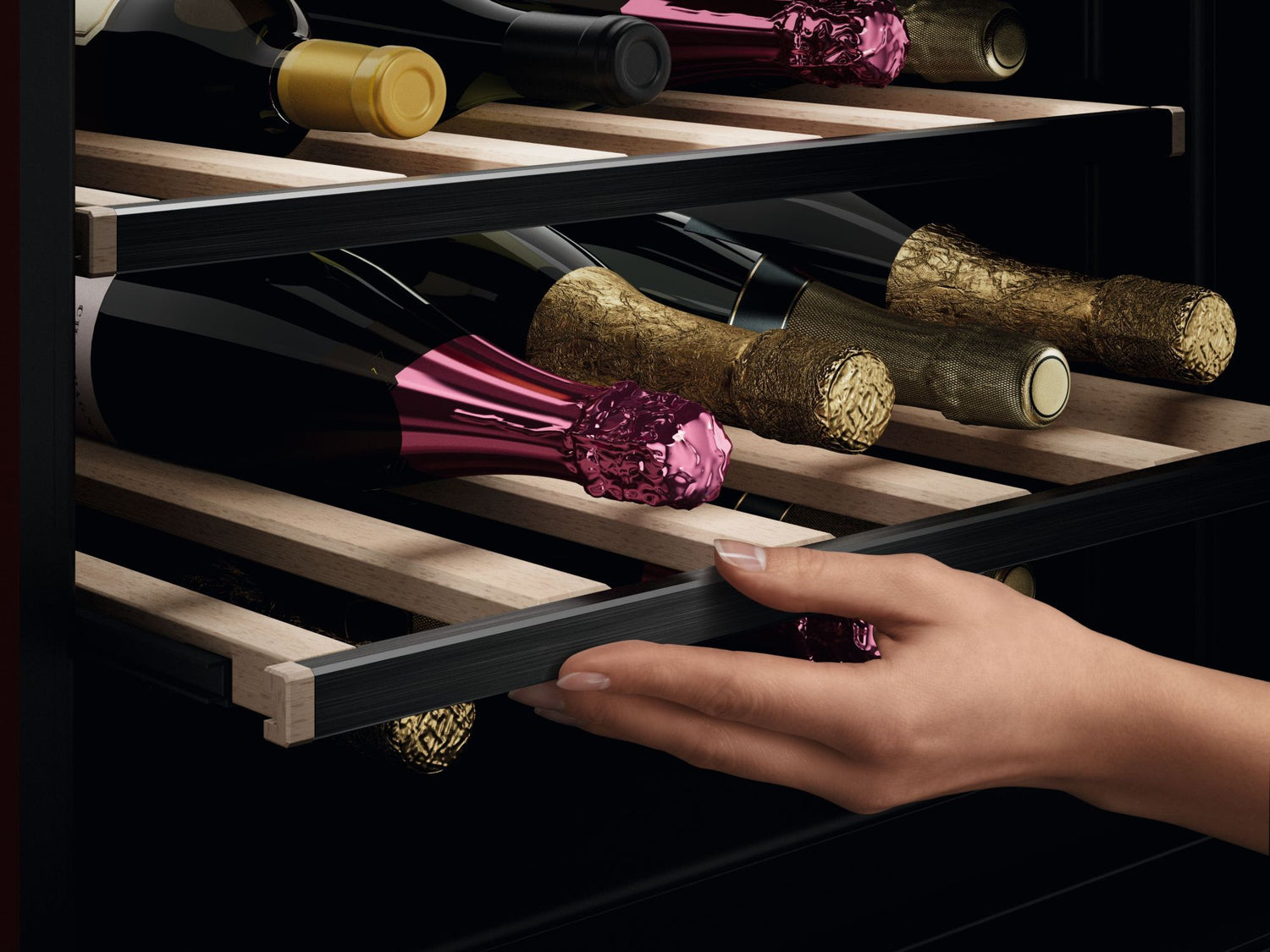 Inside, three telescopic wooden shelves provide stable and vibration-free support for your bottles, including larger Champagne bottles, without disturbing their sediment. Though the shelves are not height adjustable, they are perfectly designed to cradle wine bottles securely and attractively. The fan-circulated air and precision cooling system maintain a consistent environment, supported by humidity control to prevent corks from drying out. Auto-defrost functionality adds to the convenience by reducing maintenance, while the frost-free feature ensures that your wine remains in a stable environment without the interference of frost build-up.