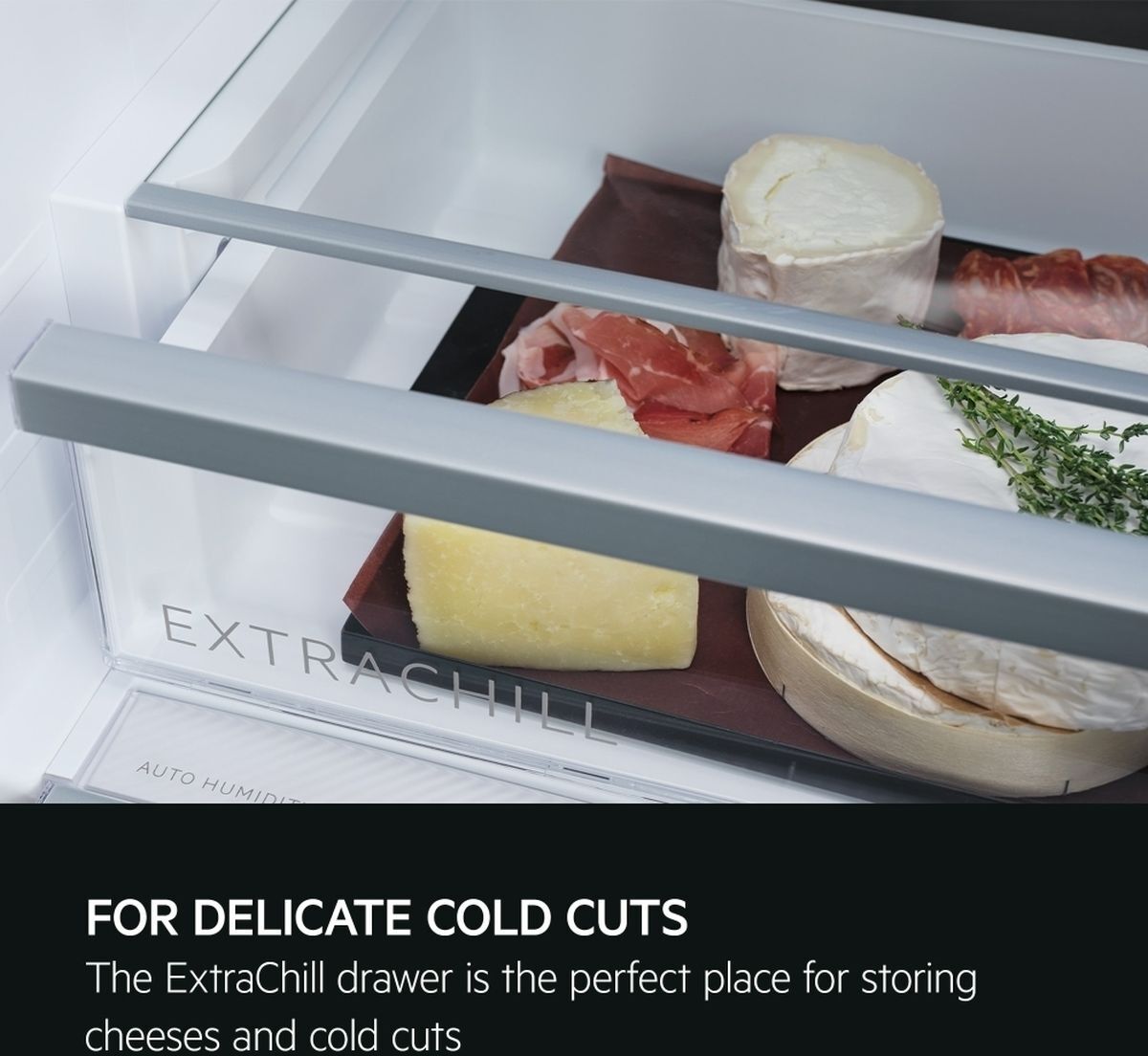 The AEG ORC7P321DX is not just functional but also highly convenient. It features adjustable glass shelves and a range of storage options, including a bottle storage compartment in the door, a salad crisper, and an ExtraChill drawer for storing delicate items like meats and cheeses. The fridge also includes a GreenZone+ drawer, designed to maintain the right humidity levels to keep your fruits and vegetables fresh for longer. The interior is illuminated by energy-efficient LED lighting, ensuring that you can easily see and access all your items.