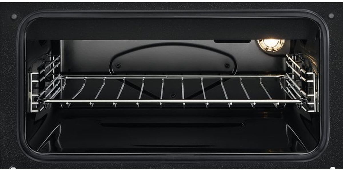 For ease of maintenance, the main oven benefits from Aqua Clean technology, which uses steam to loosen grease and food residue, while the black enamel coating in both ovens makes cleaning straightforward. The diamond-glazed enamel interior is designed to be durable and resistant to stains. With five shelf levels in the main oven and three in the top oven, along with auto-stop anti-tip chrome shelves, you can cook multiple dishes safely and efficiently.