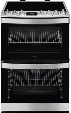 The AEG CCX6501ACM 60cm electric ceramic slot-in cooker offers versatile cooking with a spacious double oven and a sleek stainless steel finish. Its radiant ceramic hob features four cooking zones for precise heat control, while the main fan-assisted oven (77L) ensures even baking. The top oven (39L) provides conventional and grill cooking options. Aqua Clean makes maintenance effortless, and the triple-glazed glass doors enhance energy efficiency (A-rated). With intuitive rotary dials, residual heat indicators, and auto-stop chrome shelves for safety, this cooker is a reliable choice for any kitchen.