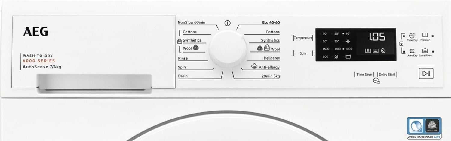 This freestanding appliance is designed for convenience and ease of use. It features a full cover door with a glass window and white trim, left-hand hinge, and a user-friendly LED display for clear cycle information. Its rotary dial and push-button controls make selecting the 14 available programmes straightforward. These include specialised options such as Wool Plus, Anti-Allergy, Delicates, and the time-saving NonStop 60-minute cycle, which washes and dries small loads in just an hour. For lighter loads, the 20-minute quick wash for up to 3kg of laundry ensures fast and effective results.