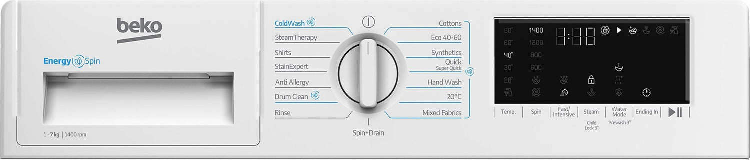 Performance is at the forefront of the Beko WTIK741511. Featuring a powerful yet energy-efficient ProSmart Inverter Motor, the machine delivers a quiet and reliable wash while helping reduce energy consumption. It carries an excellent A energy efficiency rating, reflecting its low running costs and environmentally friendly operation. The 1400rpm spin speed ensures that clothes come out with less water retained, reducing drying time whether you use a tumble dryer or prefer air drying. Despite the fast spin, the machine remains relatively quiet at just 70 dB during spinning, making it a good choice for open-plan living spaces or homes where noise is a concern.