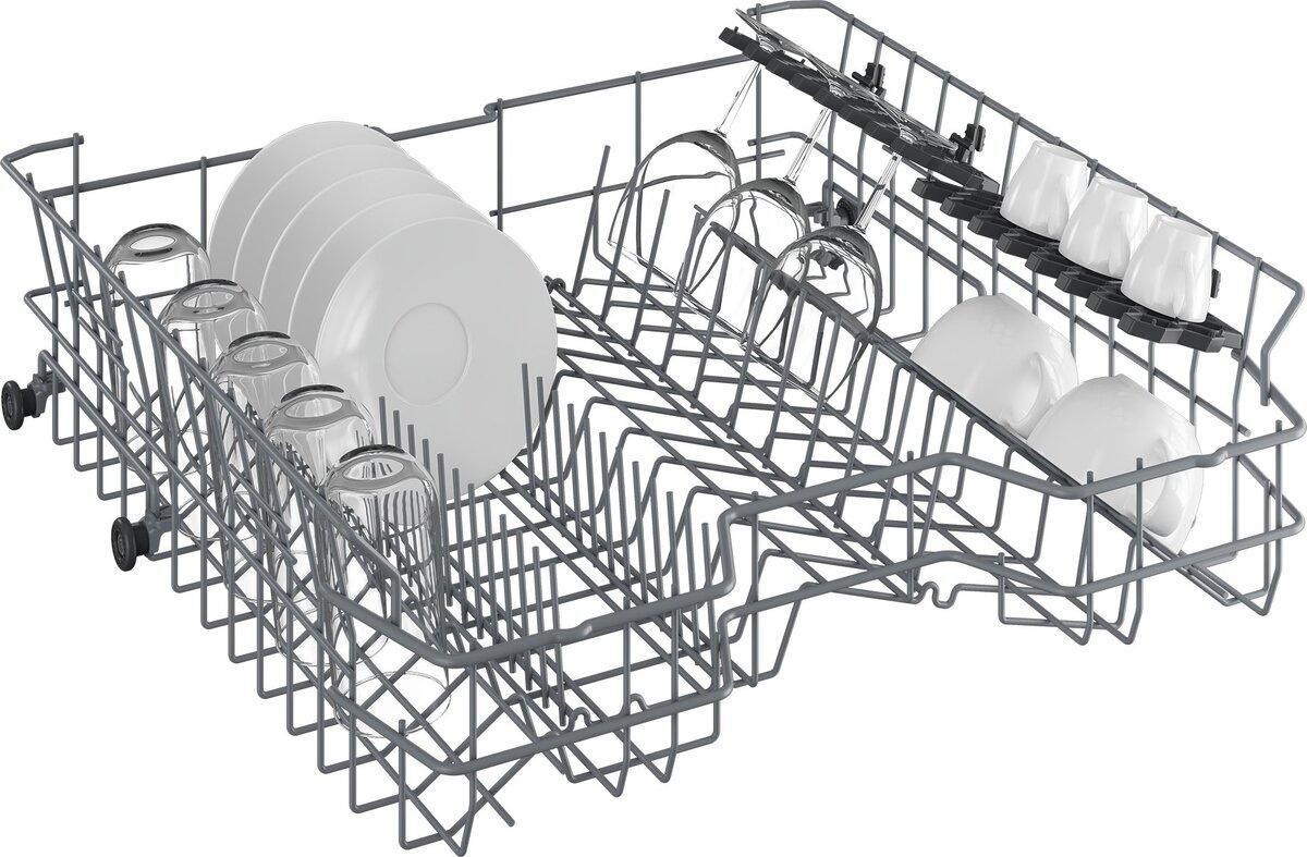 The design of the basket system in this dishwasher is particularly noteworthy. It includes a removable cutlery basket, which can be repositioned for optimal space utilization. The folding tines on the upper basket and the height-adjustable cup racks add to its versatility, accommodating various sizes of dishes and utensils.