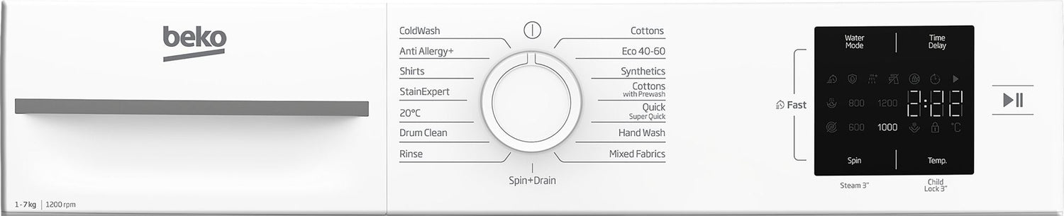 The Beko BM1WU3721W washing machine, with a 7kg drum and 1200 rpm spin speed, is a reliable, energy-efficient option rated B for both energy and spin efficiency. It features 15 wash programmes, including the StainExpert and anti-allergy cycles, ensuring versatility for all laundry needs. With a delay start function of up to 24 hours and the EasyIron anti-crease option, it offers convenience for busy households. The full-cover door, LED display, and user-friendly controls enhance the machine's design, while its water-saving mode and quick wash for small loads help reduce environmental impact.