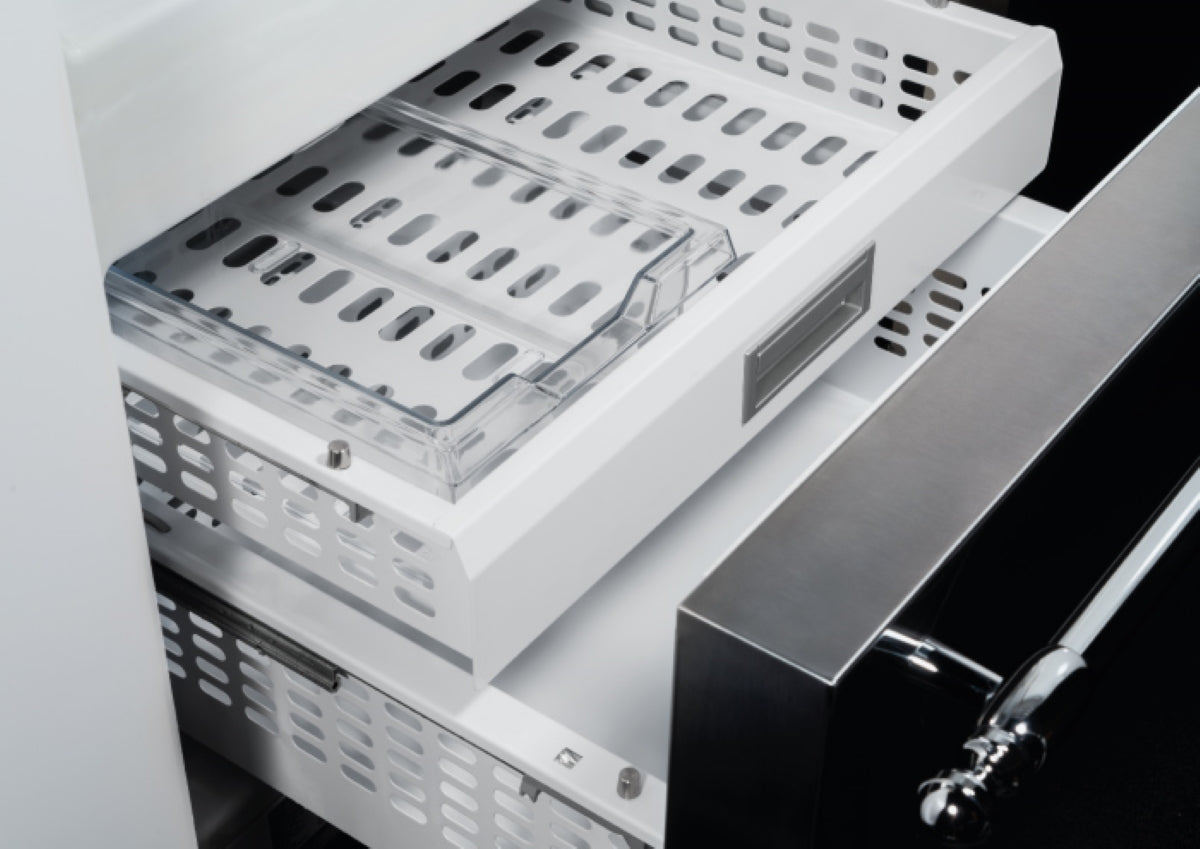 Crafted with attention to detail, the Bertazzoni Professional Series exudes sophistication. The stainless steel door exquisitely complements the white aluminium cabinet, creating a visual masterpiece. Touch controls discreetly reside inside, allowing you to effortlessly manage settings. The digital display grants a clear overview, while the adjustable glass shelves offer flexibility to accommodate various items.