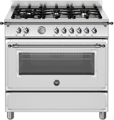 Experience culinary excellence with the Bertazzoni HER96L1EXT Heritage Series 90 cm Range Cooker. This dual fuel marvel, with an A energy efficiency rating, boasts six brass burners, including a dual wok, and a spacious oven cavity featuring 12 cooking functions. Its stainless steel design, metal-coated knobs, and anti-slam oven door exude sophistication. Practical features like cast iron pan supports, a storage drawer, and flame failure devices ensure safety and convenience. Ideal for gourmet enthusiasts, the HER96L1EXT makes cooking effortless and stylish, delivering exceptional performance and reliability for any kitchen.