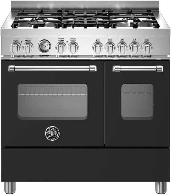 This 90cm wide Bertazzoni range cooker has two oven cavities and 5 gas burners. The hob features cast iron pan supports, a flame failure device and continuous grating. The main oven cavity has 11 functions including a bake function and a pizza function. This range cooker is controlled by the solid metal knobs.