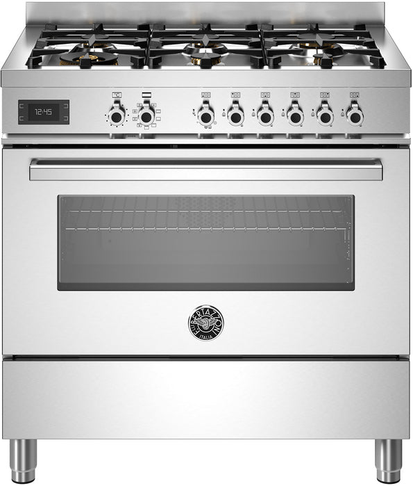 This stainless steel Bertazzoni range cooker has one oven cavity and 6 gas burners. The storage drawer at the bottom is useful for storing cooking pans. The oven has 11 functions including a dehydrate function and a convection function. The gas hob features continuous grating, cast iron pan supports and a flame failure device.