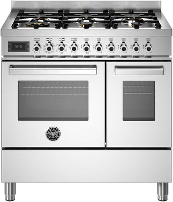 This stainless steel Bertazzoni range cooker has 6 gas burners including a dual wok burner and two oven cavities. The main oven cavity has 11 functions including a convection function and an upper bake function. The auxiliary oven cavity functions include a grill function and a bottom bake function. The hob features cast iron pan supports and a flame failure device.