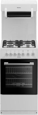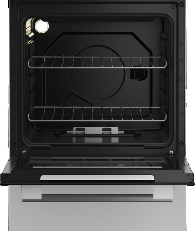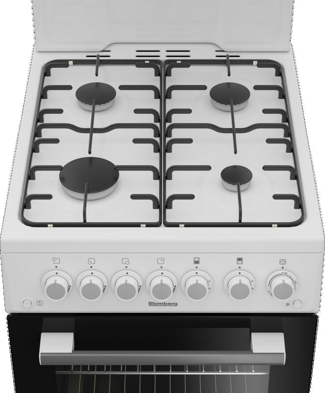 This white Blomberg slot-in gas cooker has four burners, a 61L oven capacity and an eye level grill. The oven cavity features 5 shelf positions, two shelves and an interior light. Equipped with a flame failure safety device, this cooker will automatically cut off the gas supply if the flame extinguishes. The rotary dial controls for this cooker are on the main control panel.