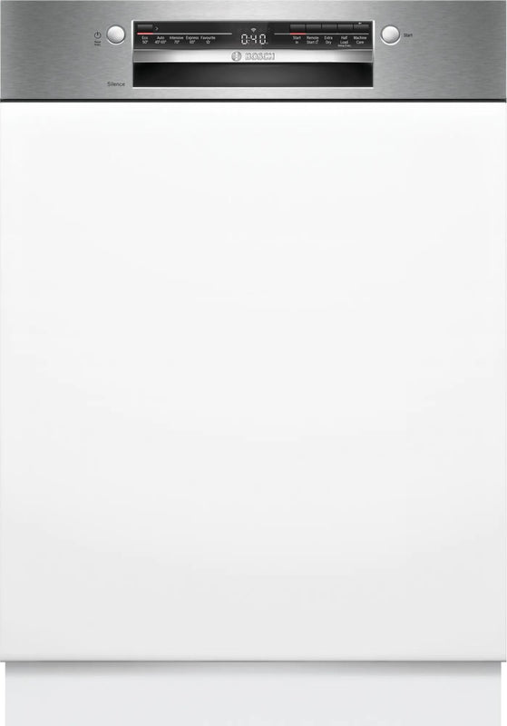 Introducing the Bosch SMI2HTS02G 60 cm semi-integrated dishwasher. Efficiently designed with an Eco-friendly D rating, it ensures sparkling dishes while conserving energy. With a spacious interior accommodating up to 13 place settings, it offers diverse programmes like Eco, Auto, and Express for versatile cleaning. Innovative features such as Home Connect app control, AquaStop safety, and AquaSensor III enhance convenience and reliability. The flexible design includes adjustable baskets, a cutlery drawer, and foldable plate racks for customised loading. Experience cutting-edge technology with Home Connect connectivity, efficient drying, and AquaMix glass protection. Simplify dishwashing with Bosch's reliable performance and intelligent design.