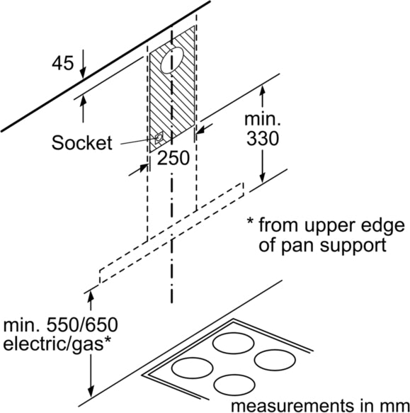 65 cm. This ensures safe operation and adherence to safety standards. The Bosch DWB64BC50B is designed for wall-mounted installation, allowing it to be placed directly above your cooking area for maximum efficiency in smoke and odour extraction.