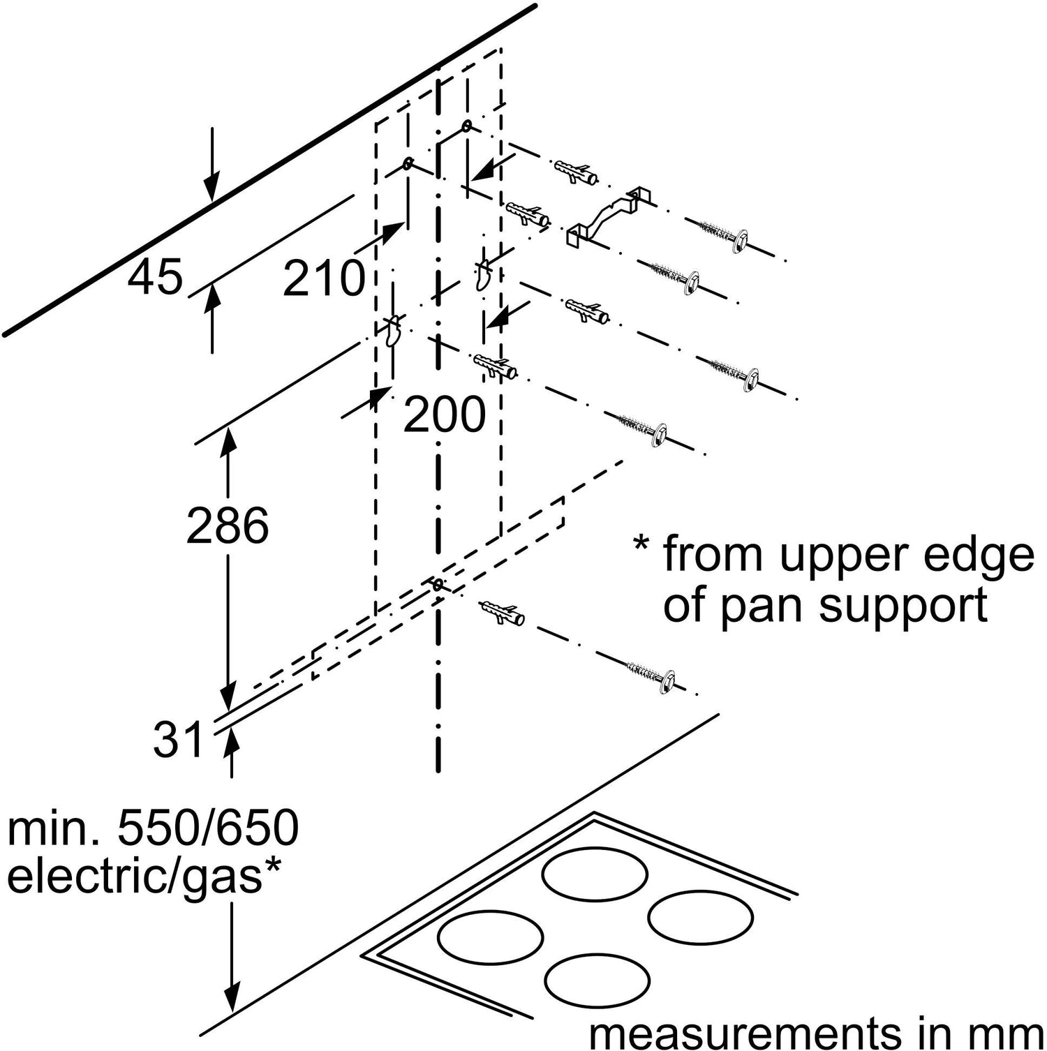 Technical specifications of the Bosch DWG64BC50B are thoughtfully designed for user convenience and efficiency. The annual energy consumption stands at 53 Kwh/year, underlining its energy-efficient operation. A cord length of 1.3 m provides flexibility in installation, and the product comes with a duct size of 150 mm, including a 120 mm adaptor, catering to different ventilation requirements. The minimum distance from cooking tops is set at 55 cm for electric and 65 cm for gas, ensuring safety and optimal performance.