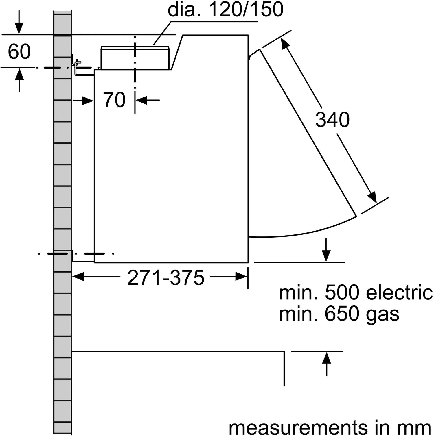 In terms of technical specifications, the DEM63AC00B has an annual efficiency consumption of 66 kWh/year, indicating its energy efficiency. The cord length of 1.5 m provides sufficient reach for easy installation. It also includes a duct size of 150 mm, with a 120 mm adaptor supplied, making it adaptable to different kitchen setups. The minimum distance from the cooking top is specified as 50 cm for electric cooktops and 65 cm for gas cooktops, ensuring safety and compliance with standards.