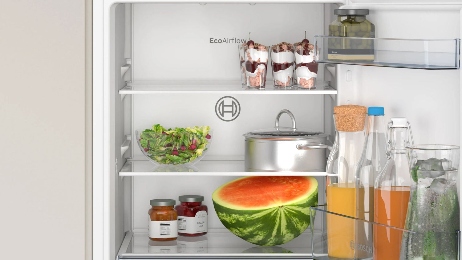 One of the key features of the Bosch KIR21NSE0 is its Eco AirFlow technology, which ensures consistent temperature distribution throughout the fridge. This helps to keep your food fresher for longer, no matter where it is stored. The Super Cool function is another highlight, allowing you to quickly reduce the temperature when new items are added, ensuring they are cooled rapidly and preserving their freshness.