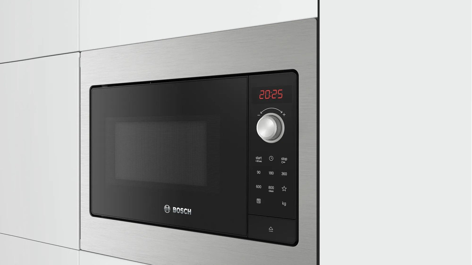Discover the Bosch BFL523MS3B Series 2 Microwave, a stylish and efficient addition to any kitchen. Its 20L capacity and 800W power, coupled with five power levels, ensure versatile cooking options. The intuitive knob control, left-hinged door, and open button offer ease of use, while the red LED display adds a modern touch. Experience simplified cooking with AutoPilot 7, choosing from pre-set programs for perfect results. Safety features include an automatic switch-off and control panel lock. The Hydrolyse Programme aids easy cleaning, and LED lighting enhances visibility. This built-in microwave, with its black and stainless steel design, promises both functionality and elegance.