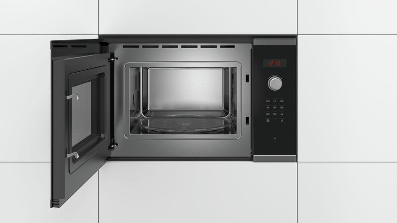 The Bosch BFL553MS0B Series 4 Built-In Microwave Oven combines style with practicality, perfect for modern kitchens. This stainless steel and black appliance features a 31.5 cm glass turntable, accommodating various dish sizes. User-friendly with touch controls and retractable dials, it ensures easy operation. The left-hand hinged door and LED light enhance convenience and visibility. Featuring AutoPilot 7, it offers 7 pre-set automatic programmes for effortless cooking. This function adjusts the mode, temperature, and duration, guaranteeing perfect results. With a 25-litre capacity and designed for tall housing installation, the Bosch BFL553MS0B is an ideal choice for efficient, stylish cooking.