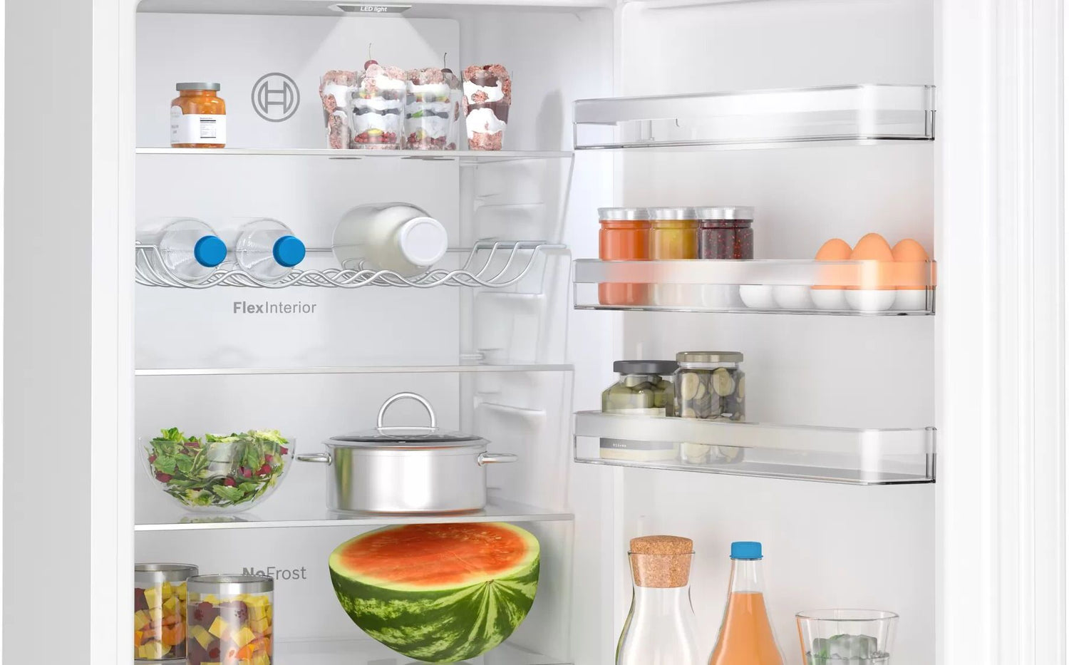 The Bosch Series 4 KGN392WDFG is equipped with various practical features such as an open door alert, height-adjustable shelves, and an egg tray. The FreshSense technology ensures a constant temperature, maintaining the freshness and flavour of your food. The dual cooling circuits allow for independent temperature control of the fridge and freezer compartments, preventing odour transfer and ensuring optimal conditions for your food.
