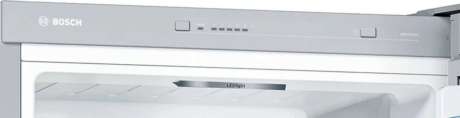 The Bosch KGV33VLEA features an electronic control type that allows for precise temperature management. The innovative FreshSense technology ensures that the temperature within the fridge is constantly monitored and controlled, providing the perfect environment for your food. This fridge freezer also includes an LED display and LED lighting, which not only gives a clear, glare-free view of the interior but is also energy-efficient.