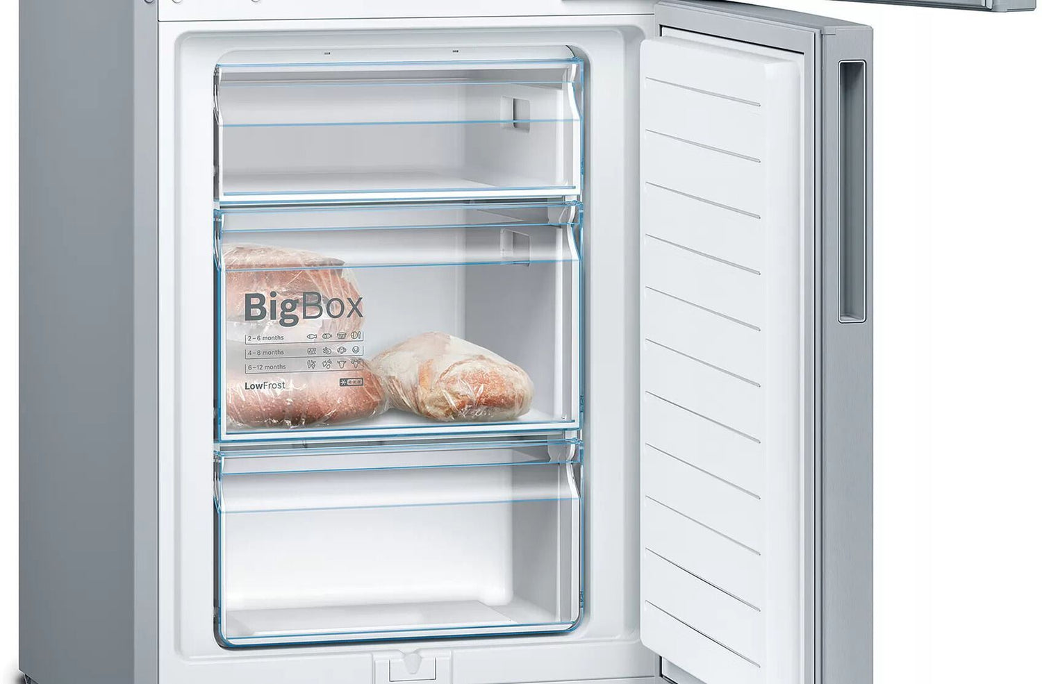 The freezer compartment of the Bosch KGV33VLEA is equally impressive. It includes 3 drawers, one of which is a BigBox - perfect for storing large frozen items or for bulk storage needs. With a 4-star freezer rating, this appliance guarantees excellent freezing quality. The Low Frost technology significantly reduces ice formation, meaning less frequent defrosting is required. When defrosting is necessary, a practical defrost water outlet is available for convenience. The appliance has a notable freezing capacity of 7 kg in 24 hours and features a Power Failure Safe Storage duration of 23 hours. Additionally, the SuperFreeze function ensures quick freezing of fresh food, preserving flavour and texture.