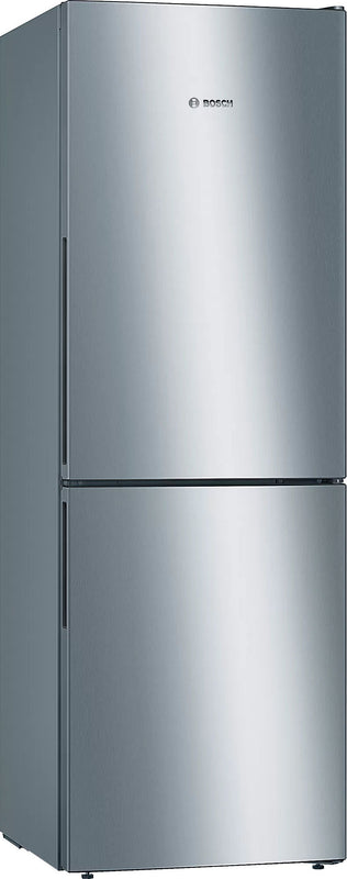 The Bosch KGV33VLEA Series 4 Low Frost Fridge Freezer, in a sleek stainless steel look, offers a harmonious blend of style and efficiency. With a total capacity of 287 litres, it features an electronic control system, FreshSense technology for consistent temperature management, and energy-saving LED lighting. The fridge section includes convenient features like EasyAccess shelves and a VitaFresh drawer, ensuring longer freshness for fruits and vegetables. The freezer boasts Low Frost technology, reducing the need for defrosting, and a SuperFreeze function for rapid freezing of fresh food. This model is designed for energy efficiency and practicality, making it a perfect addition to any modern kitchen.