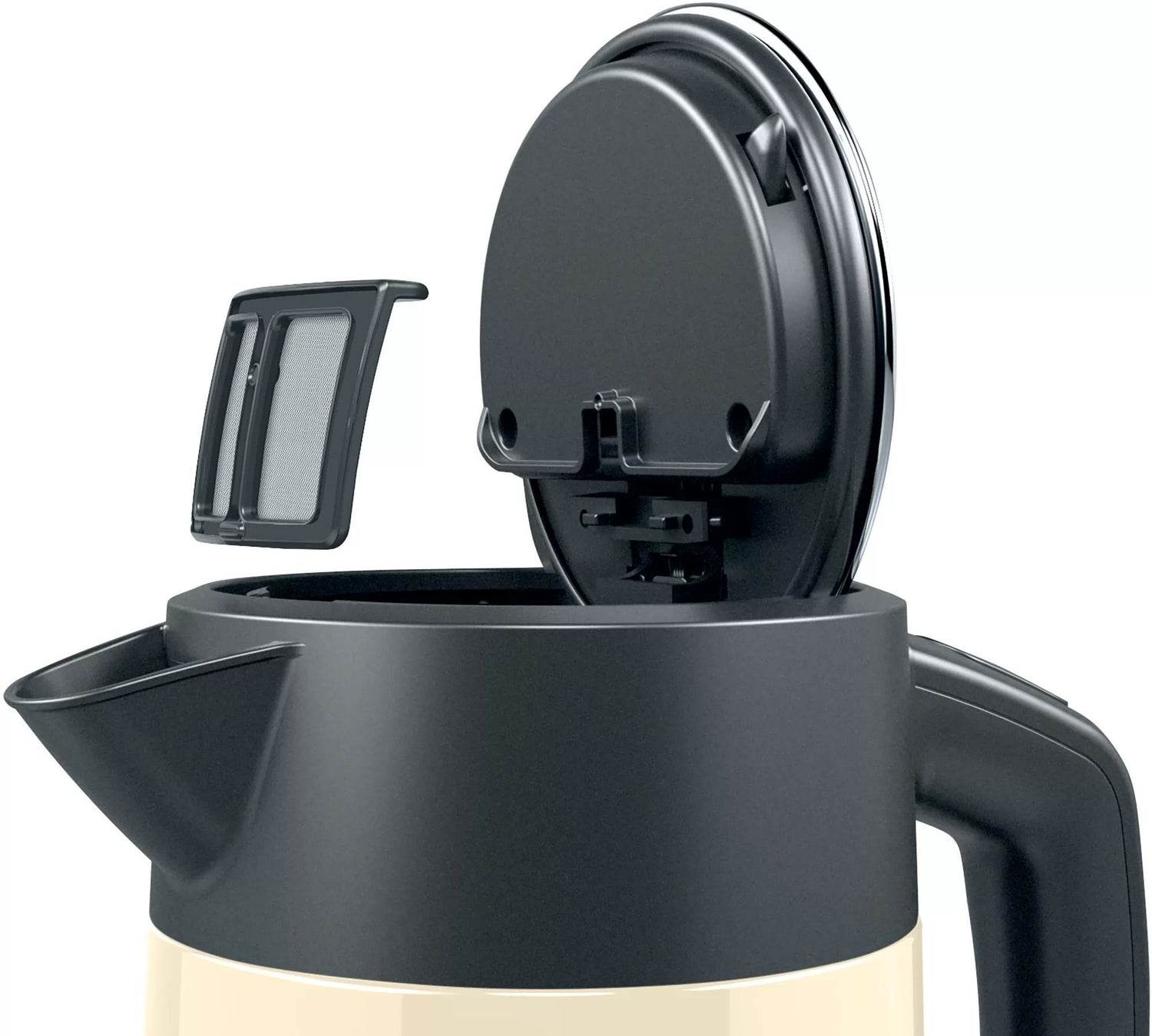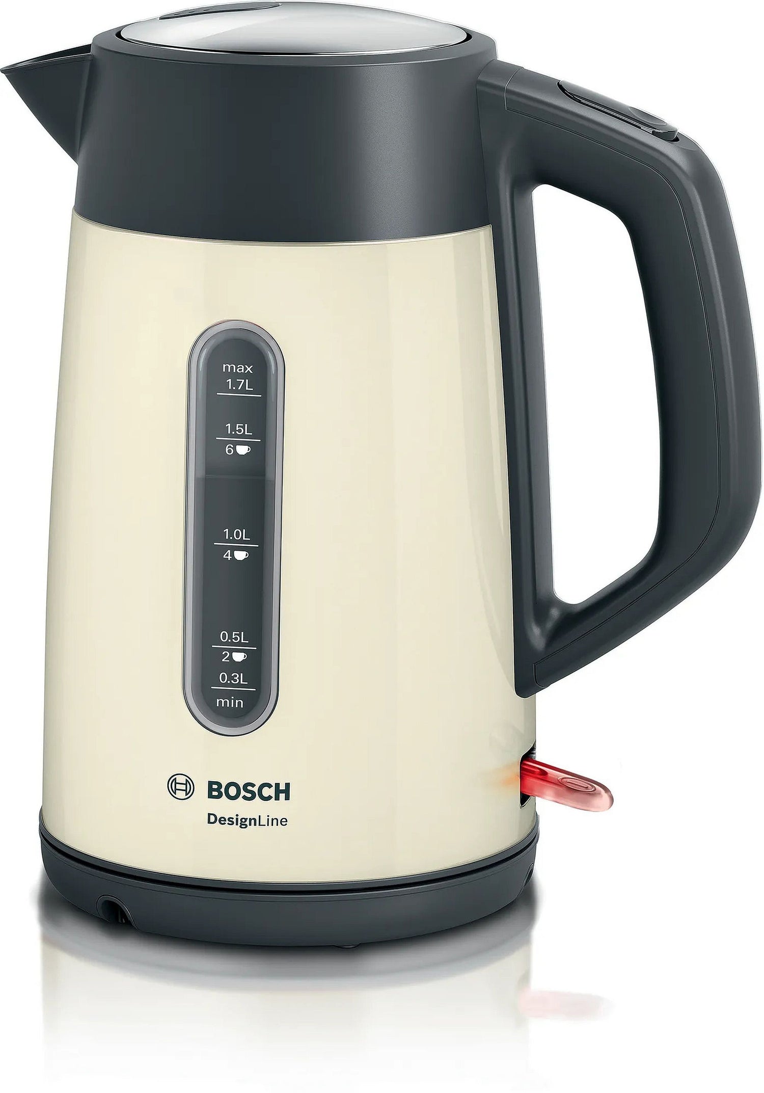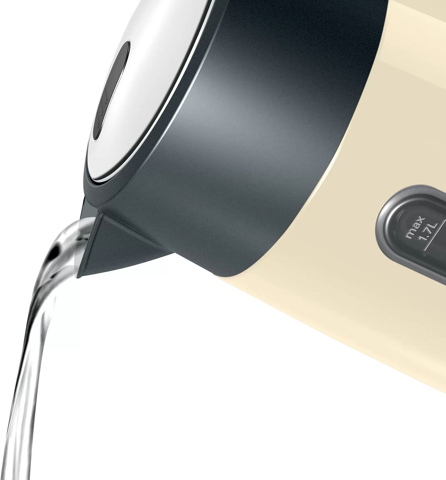 Discover the elegance and efficiency of the Bosch TWK4P437GB, a 1.7 L Jug Kettle, presented in a polished cream and black grey finish that effortlessly complements any kitchen decor. This cordless jug kettle not only enhances your kitchen's aesthetic but also promises convenience and safety with its range of features designed for ease of use and optimal functionality.