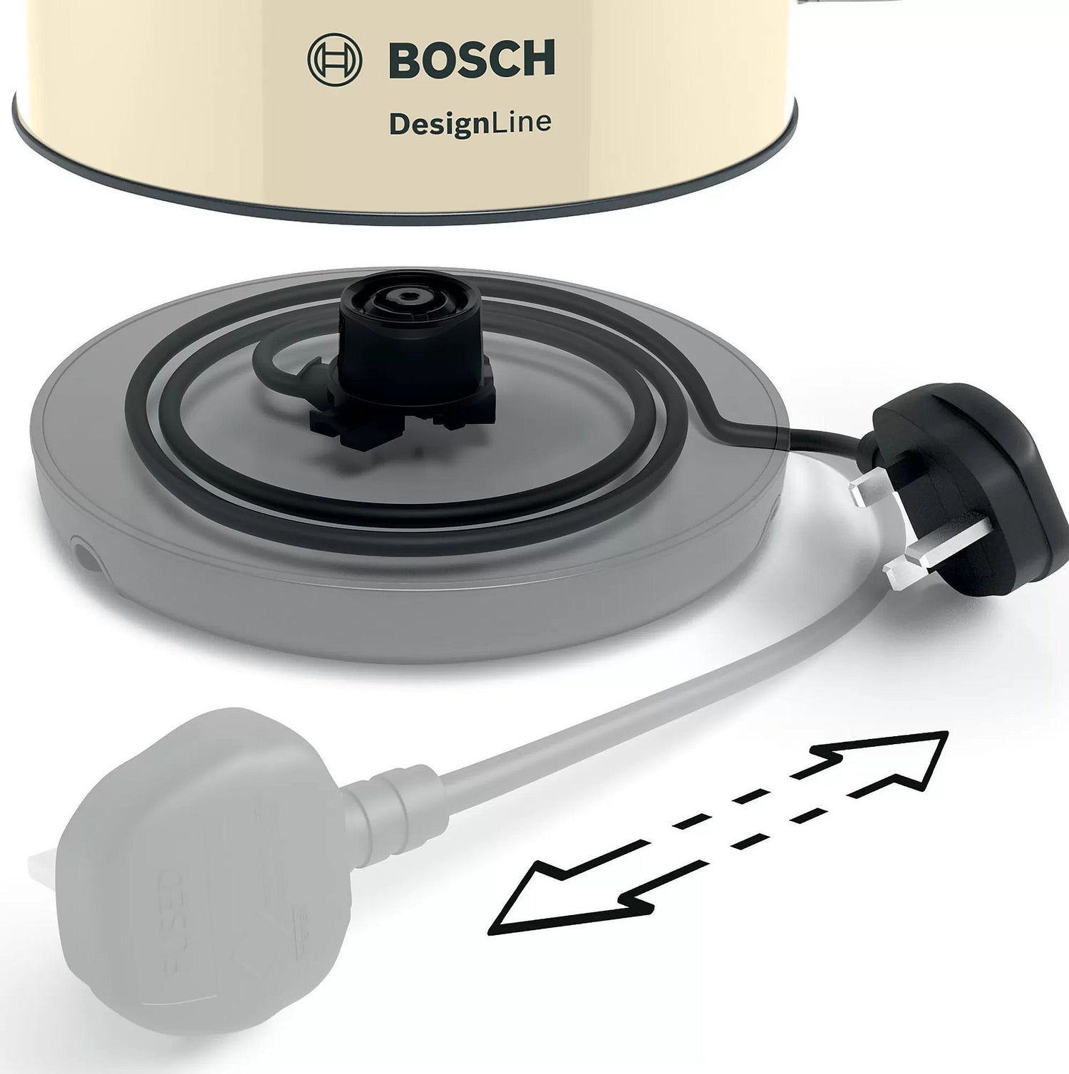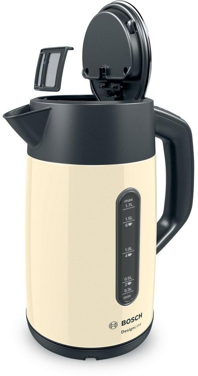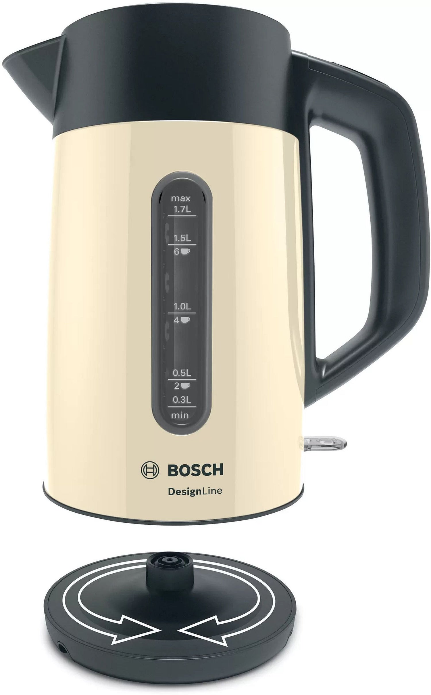 The Bosch TWK4P437GB Jug Kettle, in polished cream, combines style with practicality for the modern kitchen. Its cordless design and 1.7 L capacity cater to convenience and efficiency. Features like a one-hand lid opening, visible water scale for easy filling, and a removable stainless steel limescale filter enhance usability. Safety is prioritized with automatic shut-off, dry boil protection, and non-slip feet. The concealed heating element reduces limescale build-up, ensuring longevity. With a power rating of 3 kW, it promises quick boiling, making it perfect for busy lifestyles. The Bosch TWK4P437GB is an essential, energy-saving addition to any kitchen.