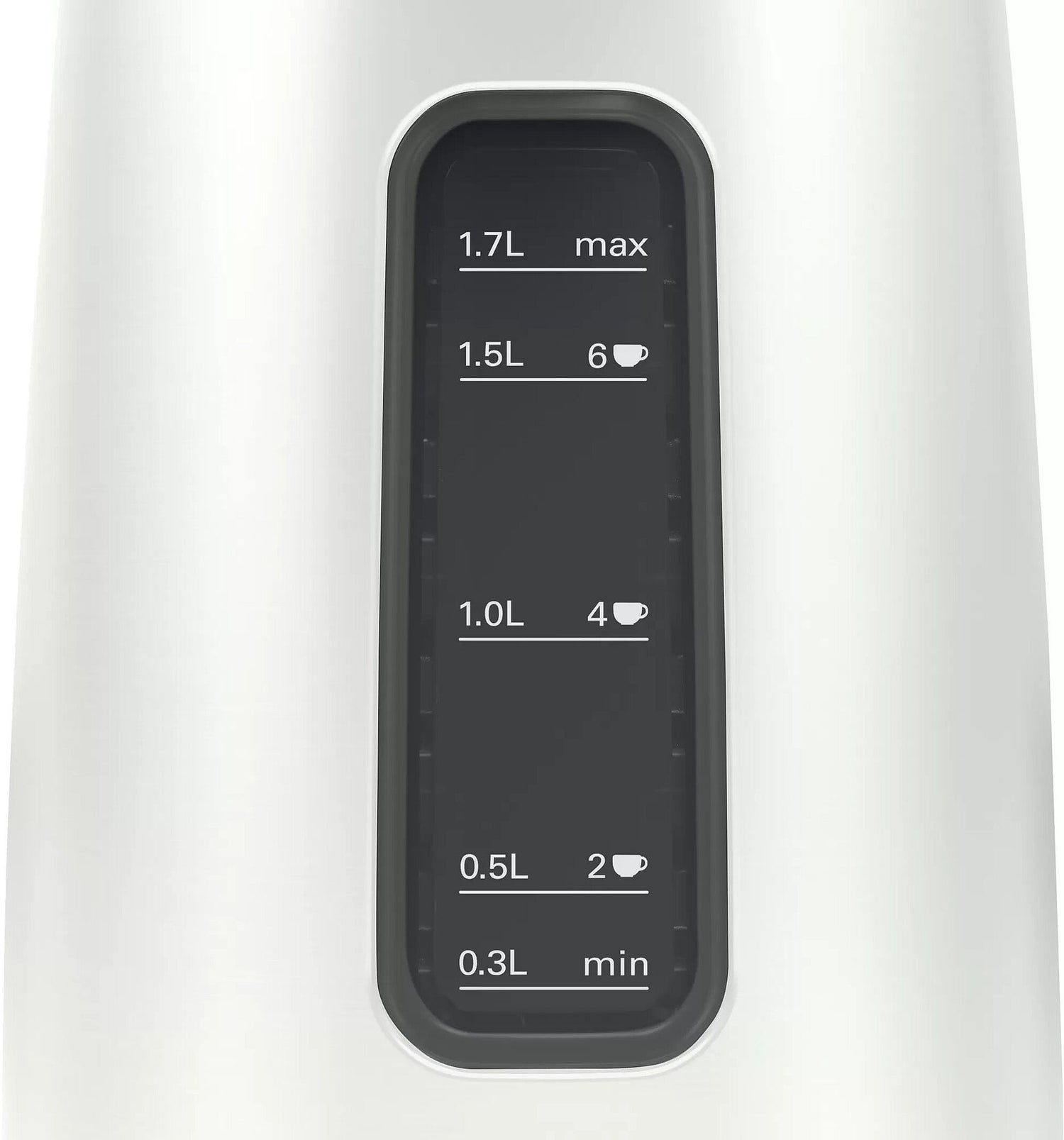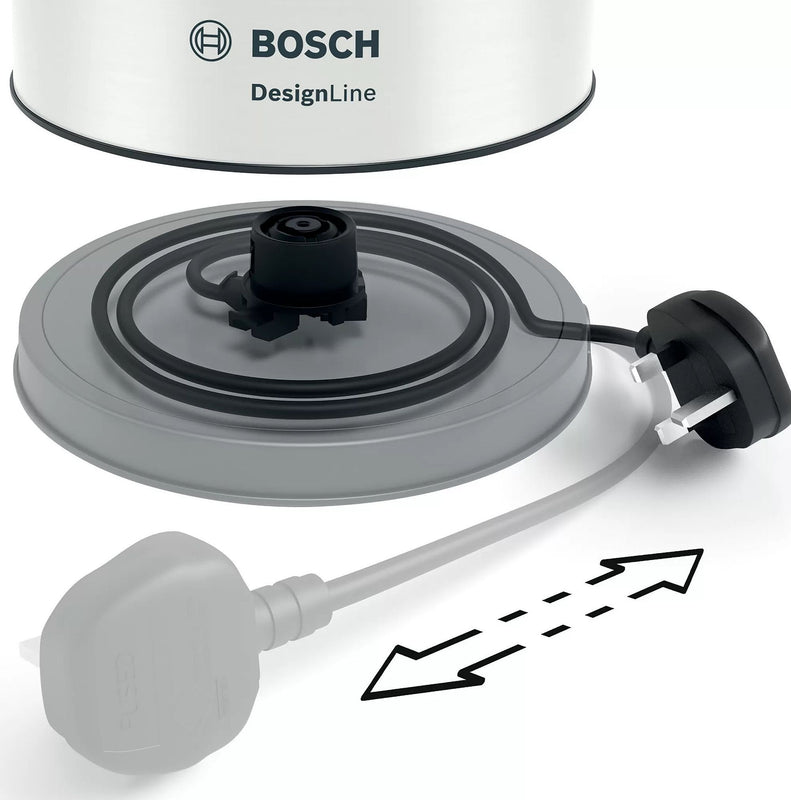 With a 3 kW power rating, the Bosch TWK5P471GB is efficient, boiling water quickly. The cord length of 0.8 meters provides enough flexibility for positioning on your kitchen counter, without unnecessary clutter. The minimum water fill of 300 ml is practical for those times when you only need a small amount of boiled water.