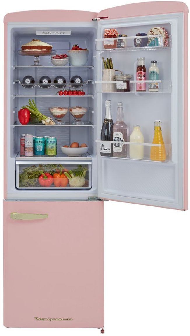 The retro-inspired Tea Rose finish adds a touch of elegance to any kitchen, complemented by an integrated handle for a sleek, minimalist look. Electronic controls and an LED display allow for precise temperature adjustments, with the fridge maintaining temperatures between 2°C and 8°C and the freezer operating at -16°C to -24°C. Height-adjustable shelves and bottle storage in the fridge door provide versatility to accommodate various storage needs.
