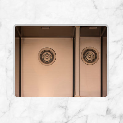 This distinctive 1.5 bowl sink combines vintage-style copper colouring with contemporary, hygienic brushed stainless steel. The main sink bowl is 20cm deep and the smaller bowl on the right hand side is 13.5cm deep, giving you flexibility and ample space. The two bowls contain waste outlets with basket strainers and overflows and it is suitable for a waste disposal system.