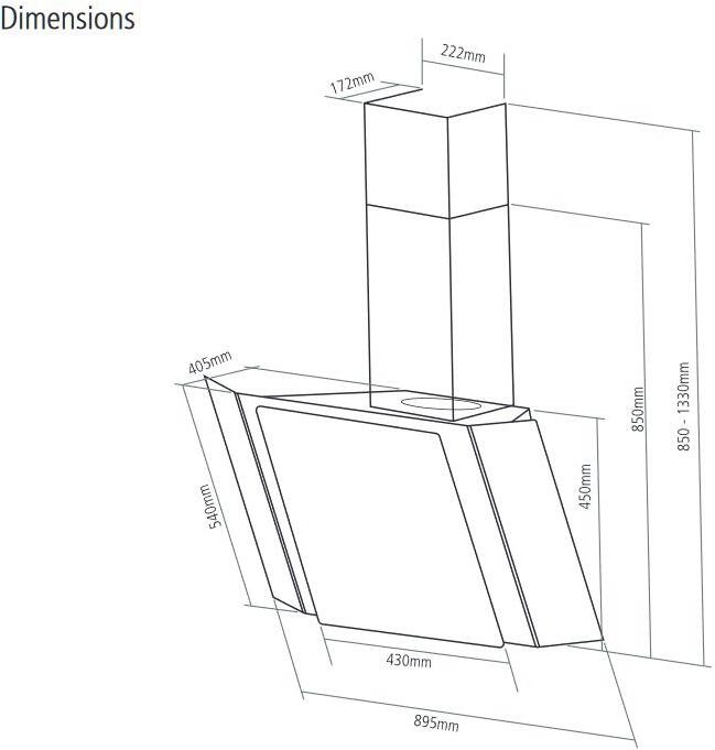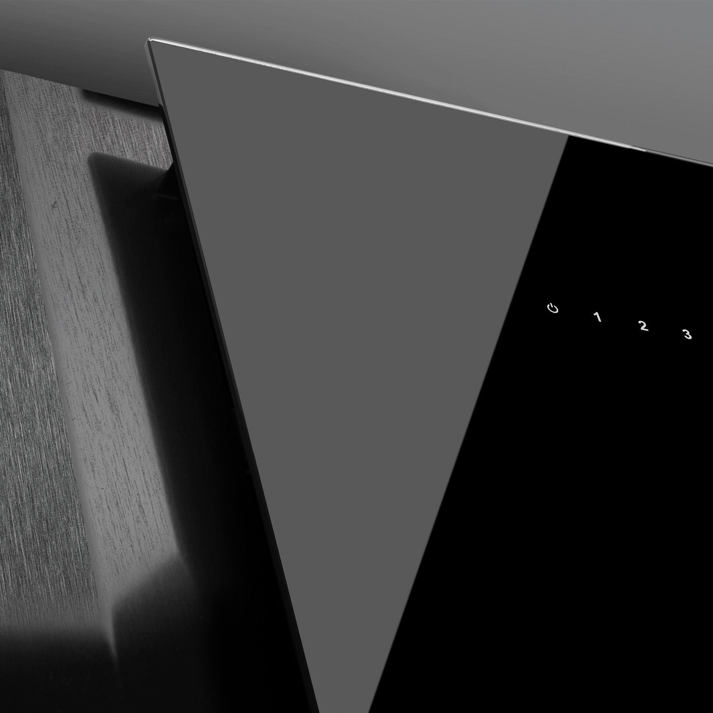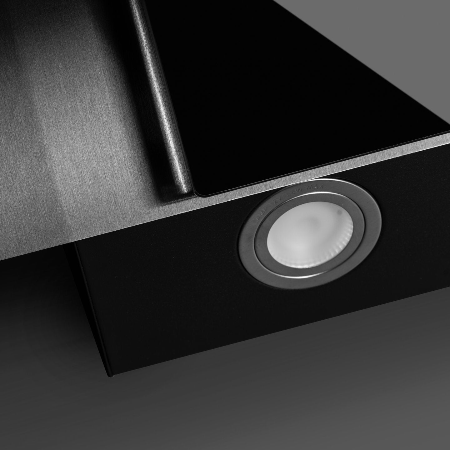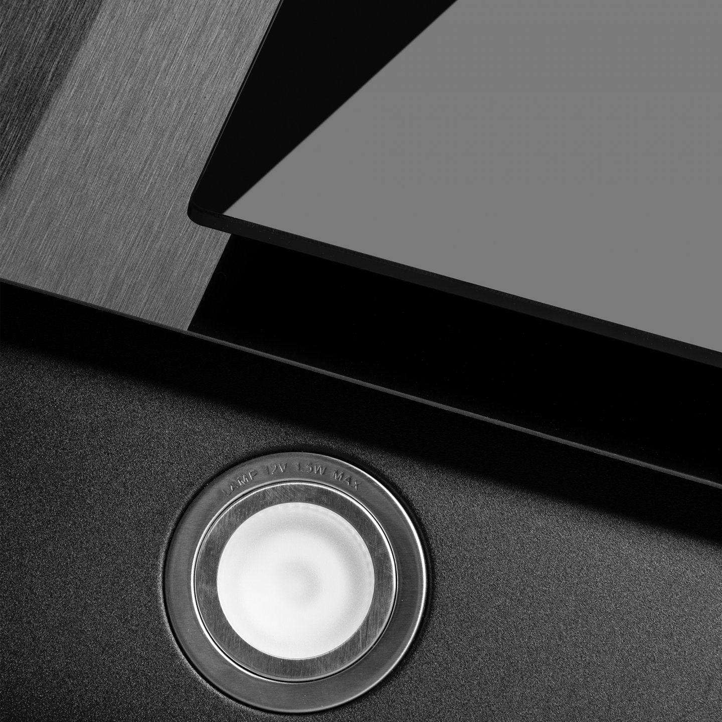 This stylish black glass and gunmetal wall-mounted chimney hood is energy-efficiency (A rated) and effective at clearing odours, steam and grease from your kitchen. Use the illuminated LED touch controls to select one of the three speeds. Its two LED lights provide bright task lighting over your hob while you cook. It can be used in recirculation mode with an activated charcoal filter, which effectively traps odours.