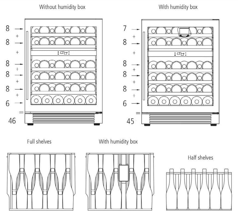 Shelves can accommodate 750ml Bordeaux, Burgundy and Champagne bottles.