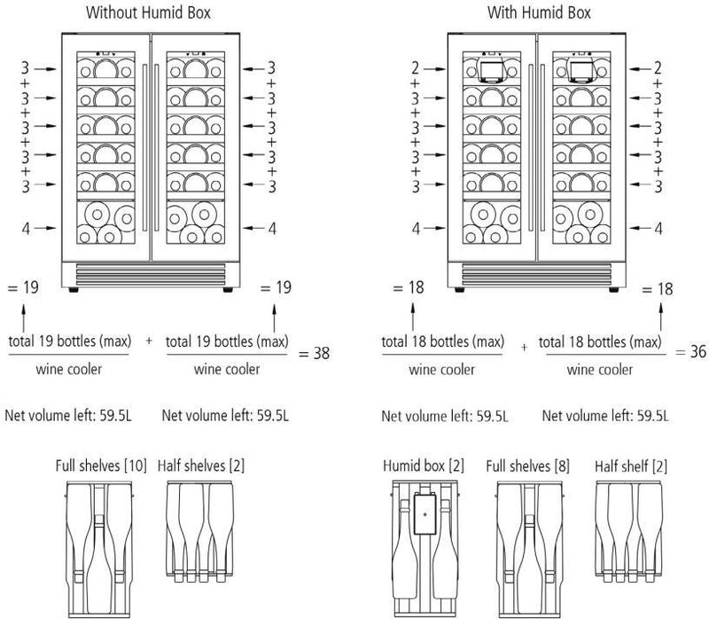The shelves in the WI6234 have been designed to accommodate 750ml Bordeaux bottles, Burgundy bottles and Champagne bottles. The wine cooler stores a maximum of 38 750ml Bordeaux bottles, 19 per zone.