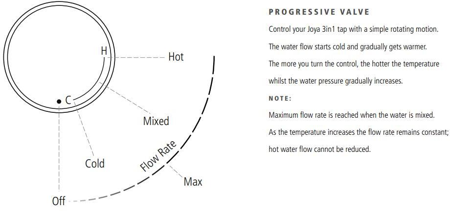 One of the key benefits of the Caple JOY3IN1-BS is its ability to supply near-boiling water instantly, perfect for making tea, coffee, or speeding up meal preparation. The tap is equipped with a progressive valve, providing precise control over hot and cold water temperatures. This gives you the flexibility to switch effortlessly between different water types based on your needs.