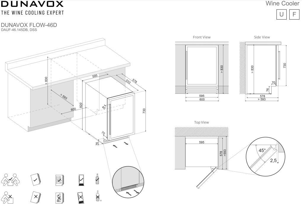 Introducing the Dunavox Flow-46D( DAUF-46-145SS), an under-counter wine cooler that elegantly combines functionality with style. With a 46 Bordeaux bottle capacity and 12 temperature zones, it offers customised storage for both red and white wines. Navigate these zones effortlessly via touch screen controls. The unit comes in a chic stainless steel and black finish with wooden shelves, adding a modern touch to any space. Equipped with fan-circulated air and humidity control, your wines are stored in optimal conditions. A lock provides added security, and adjustable feet ensure stability. Experience quiet operation at only 41 dB, making it a seamless addition to your home.