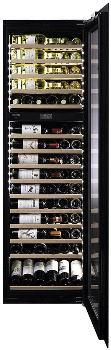 The Dunavox DVN-109-291DB-TO in-column wine cooler offers a sophisticated and functional solution for wine enthusiasts. With a capacity to accommodate 109 bottles, including Champagne, it features two temperature zones ranging from 5°C to 18°C, perfect for storing diverse wine collections. The elegant black finish and right-hand hinged door enhance any interior, while the push-to-open handle adds convenience. The cooler boasts a UV-protected glass door and telescopic wooden shelves for optimum wine preservation. Smart app WiFi connectivity and a TFT display with touch controls ensure seamless operation. The integrated ventilation system and low vibration maintain ideal storage conditions.