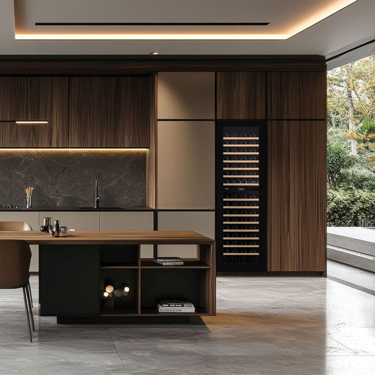 The cooler boasts a sleek black finish that seamlessly integrates into modern kitchens. Its right-hand hinged door, which can be reversed for convenience, features a UV-protected glass, safeguarding your collection from harmful light exposure. The push-to-open handle and soft-closing Hettich hinge add to the cooler’s subtle charm and ease of use.