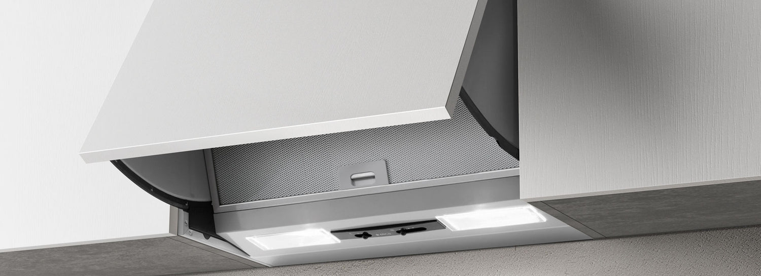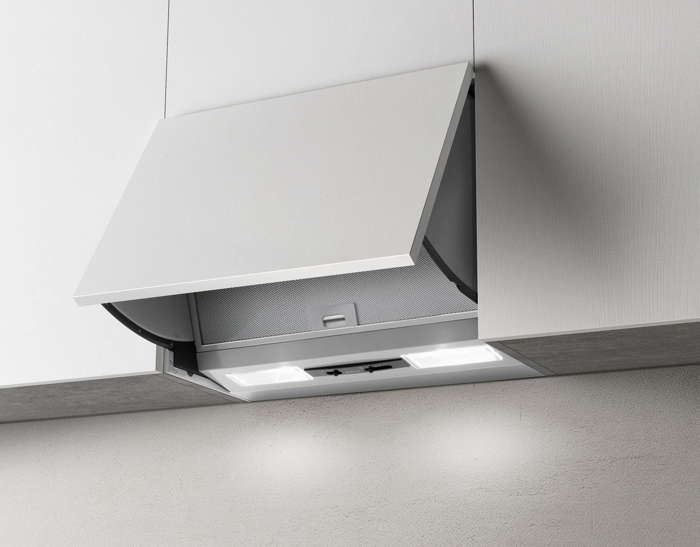 This integrated hood is discreetly hidden in a cabinet above your hob until it's needed, when you can simply pull it out and it'll get to work clearing cooking odours, vapours and grease from the air. Use the slider switches to select between the three speeds, which are capable of extracting up to 290m3 per hour, or turn on the two bright LED lights, for a clearer view of your hob.