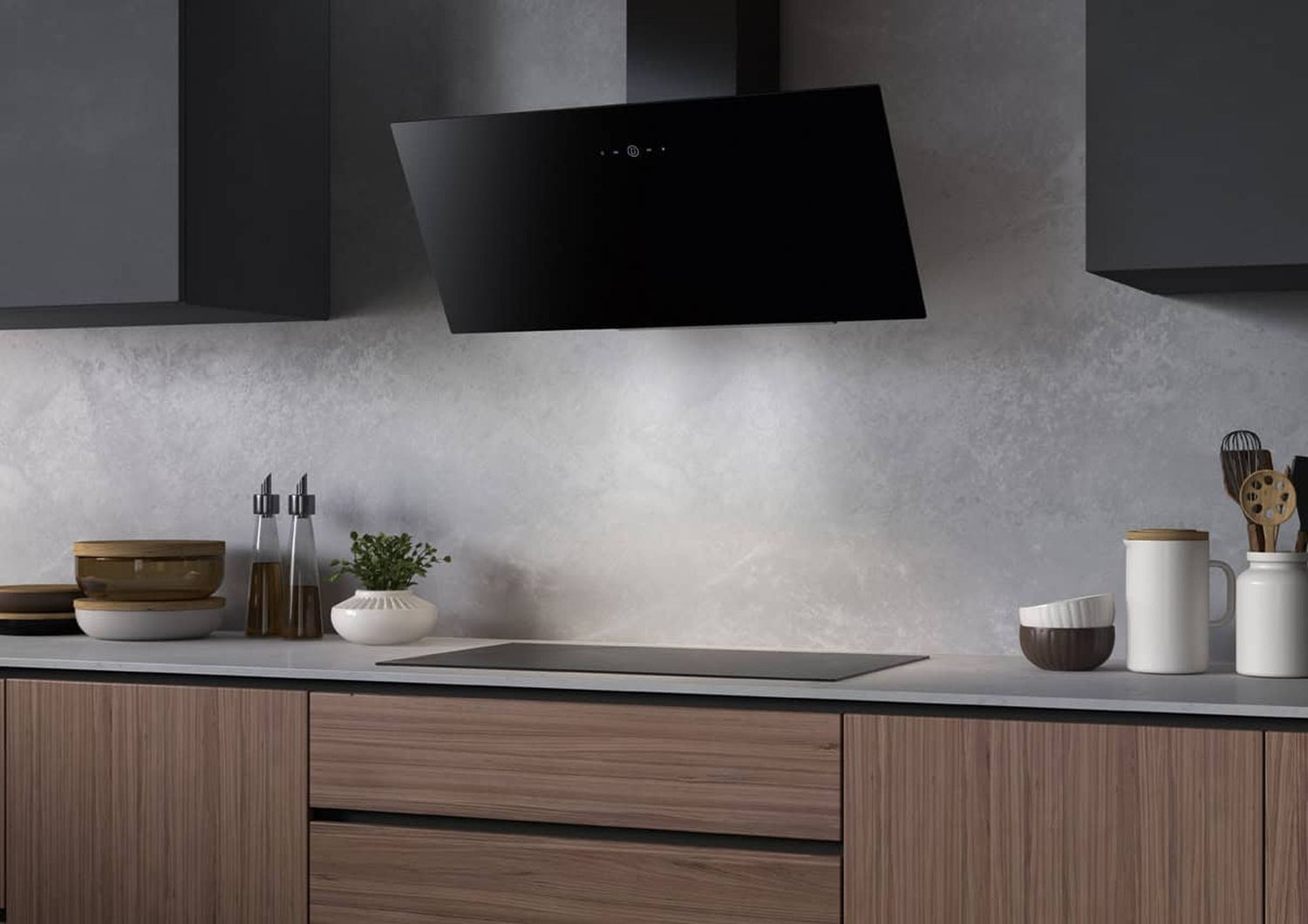 The hood's angled design is not only aesthetically pleasing but also practical, maximising headroom and creating a more open and functional cooking environment. Measuring 89.5 cm in width, it seamlessly fits over most standard-sized hobs. The touch control finish allows for intuitive and easy manipulation of settings, ensuring a seamless cooking experience.